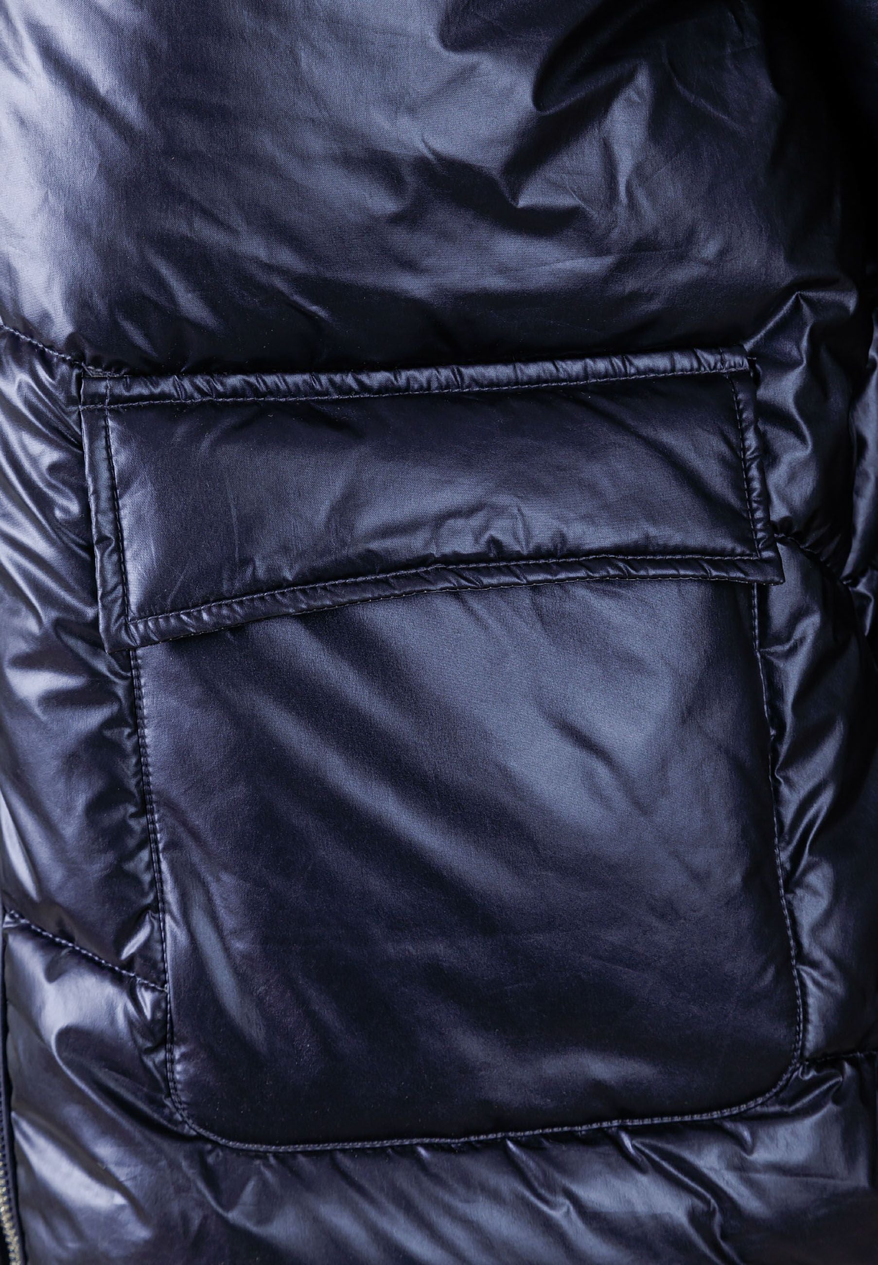 Damen gesteppte kurze Kapuzenjacke mit Reißverschluss und Taschen in Marineblau