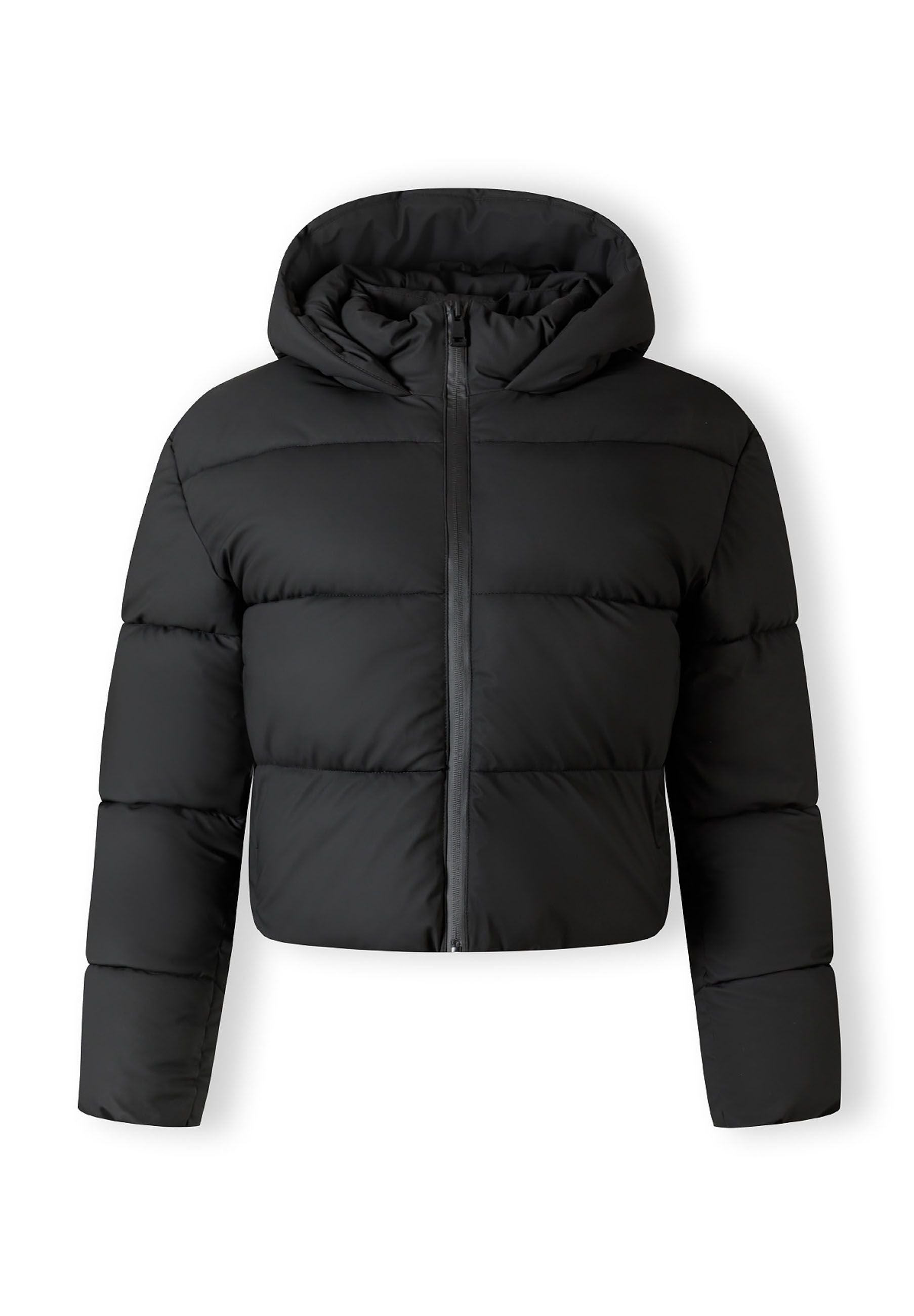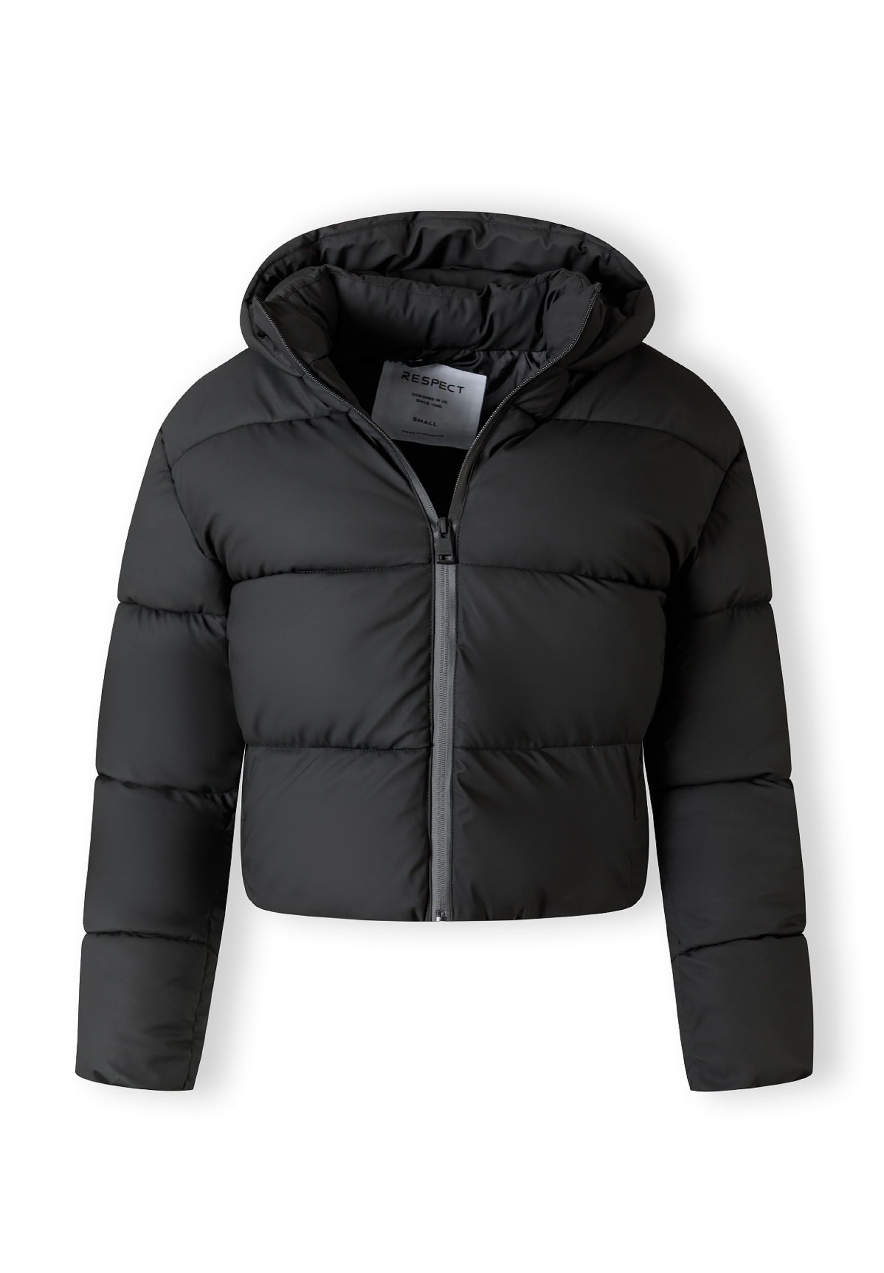 Damen kurze wasserabweisende gesteppte Jacke mit Kapuze und hohem Kragen schwarz