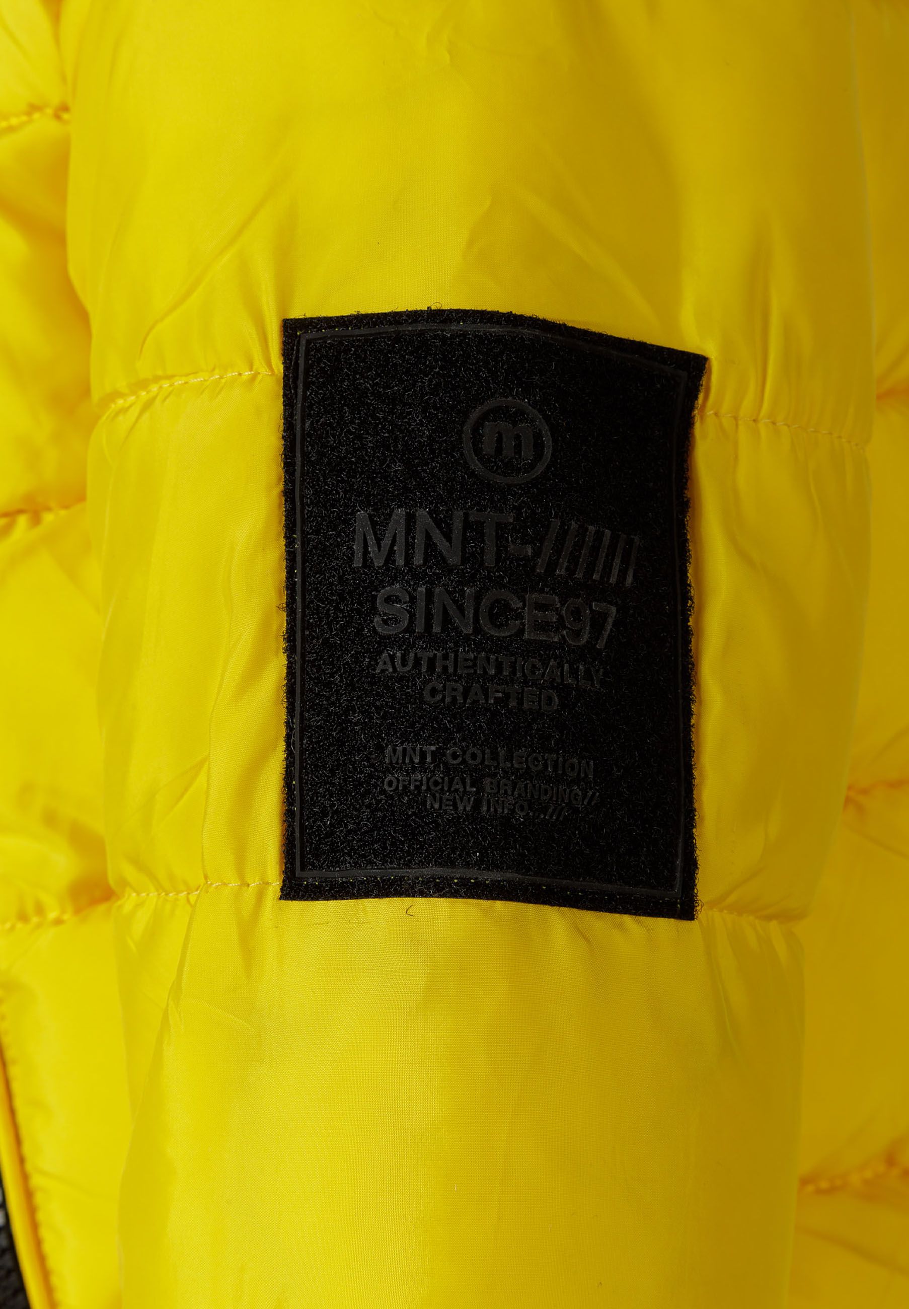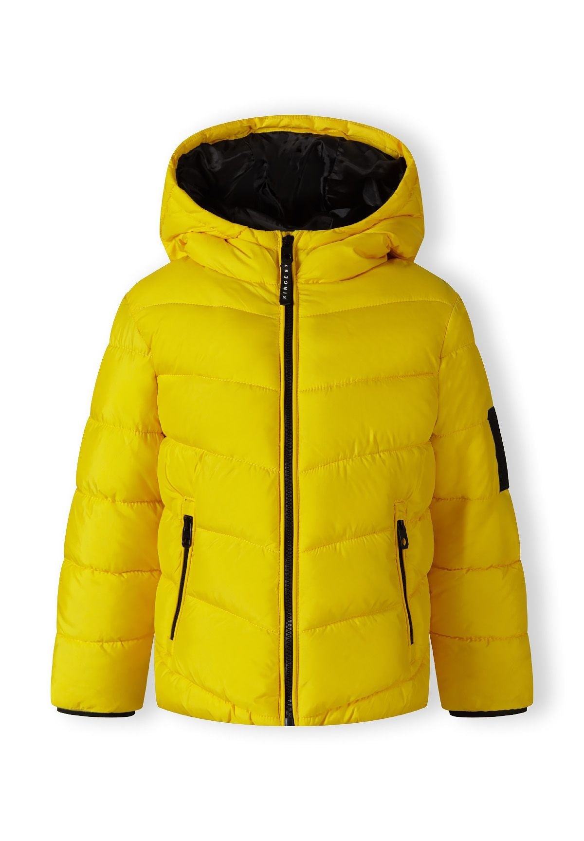 Jungen Steppjacke in leuchtendem Gelb mit Kapuze und schwarzen Akzenten