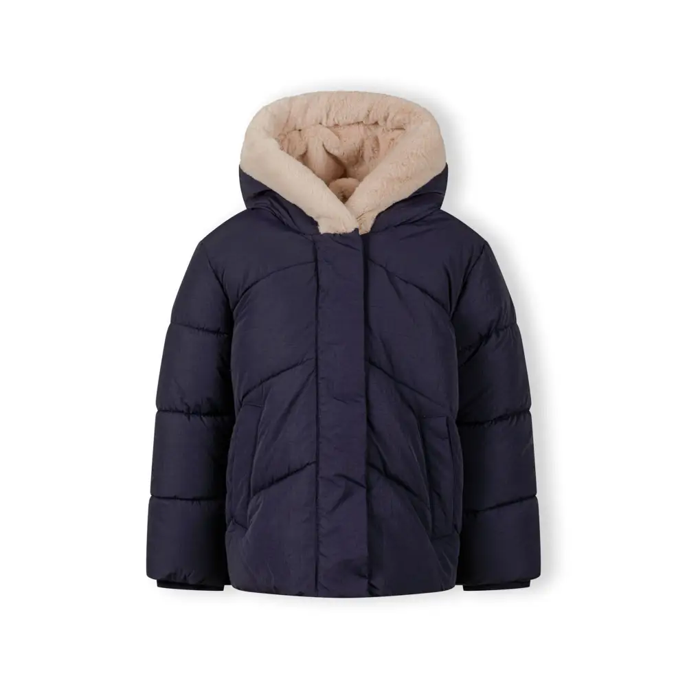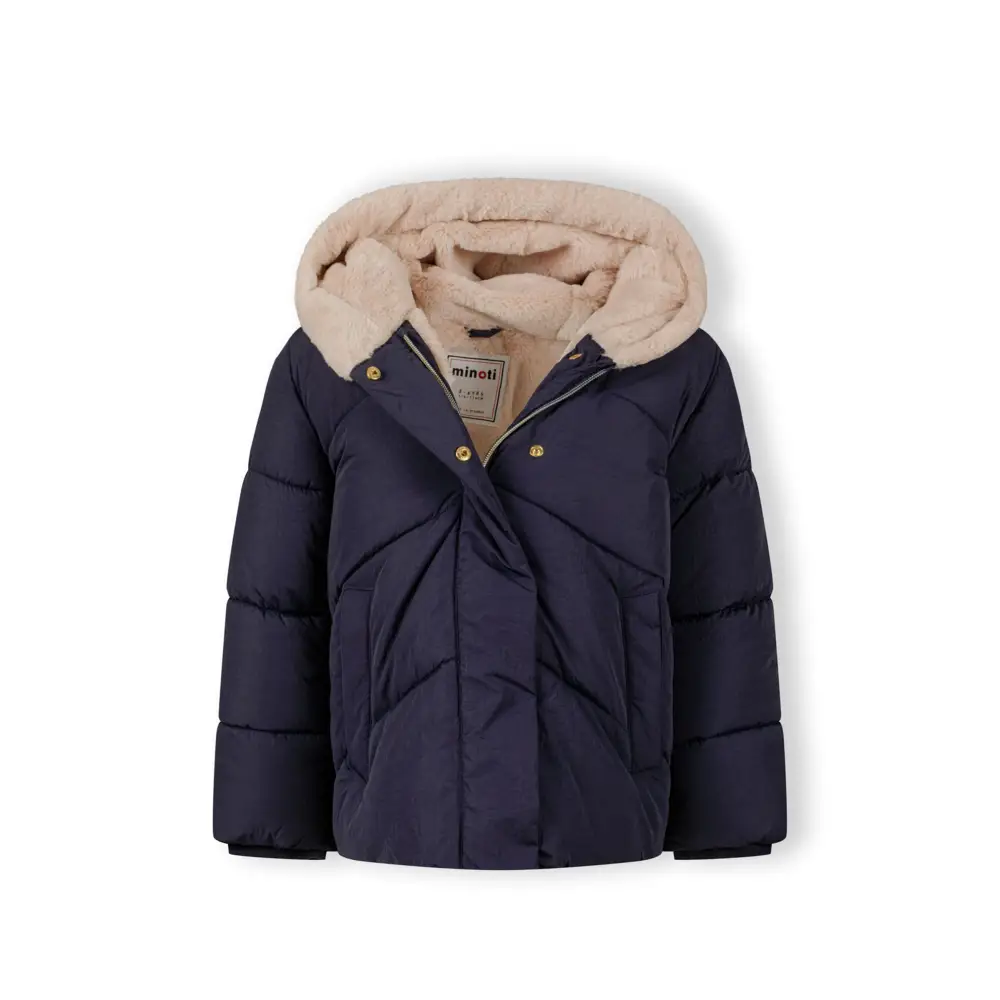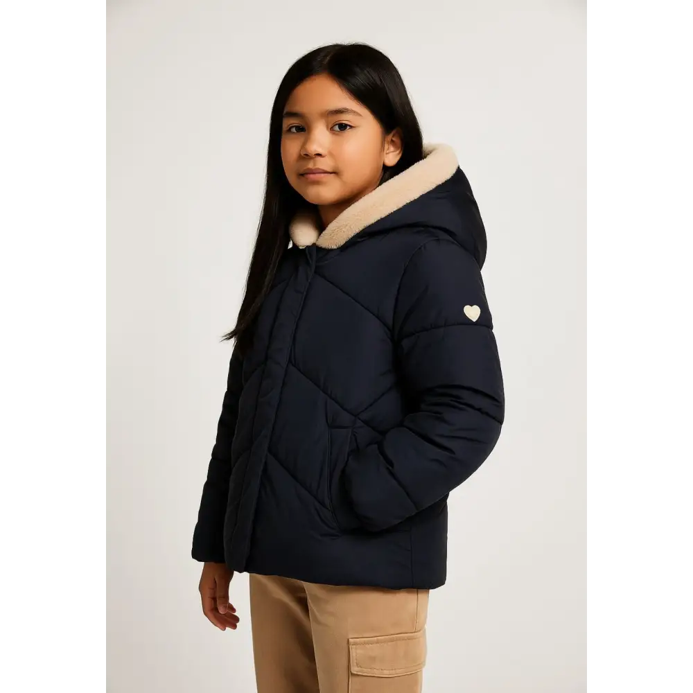 Mädchen Warme Gepolsterte Marineblaue Steppjacke mit Lammfellkapuze