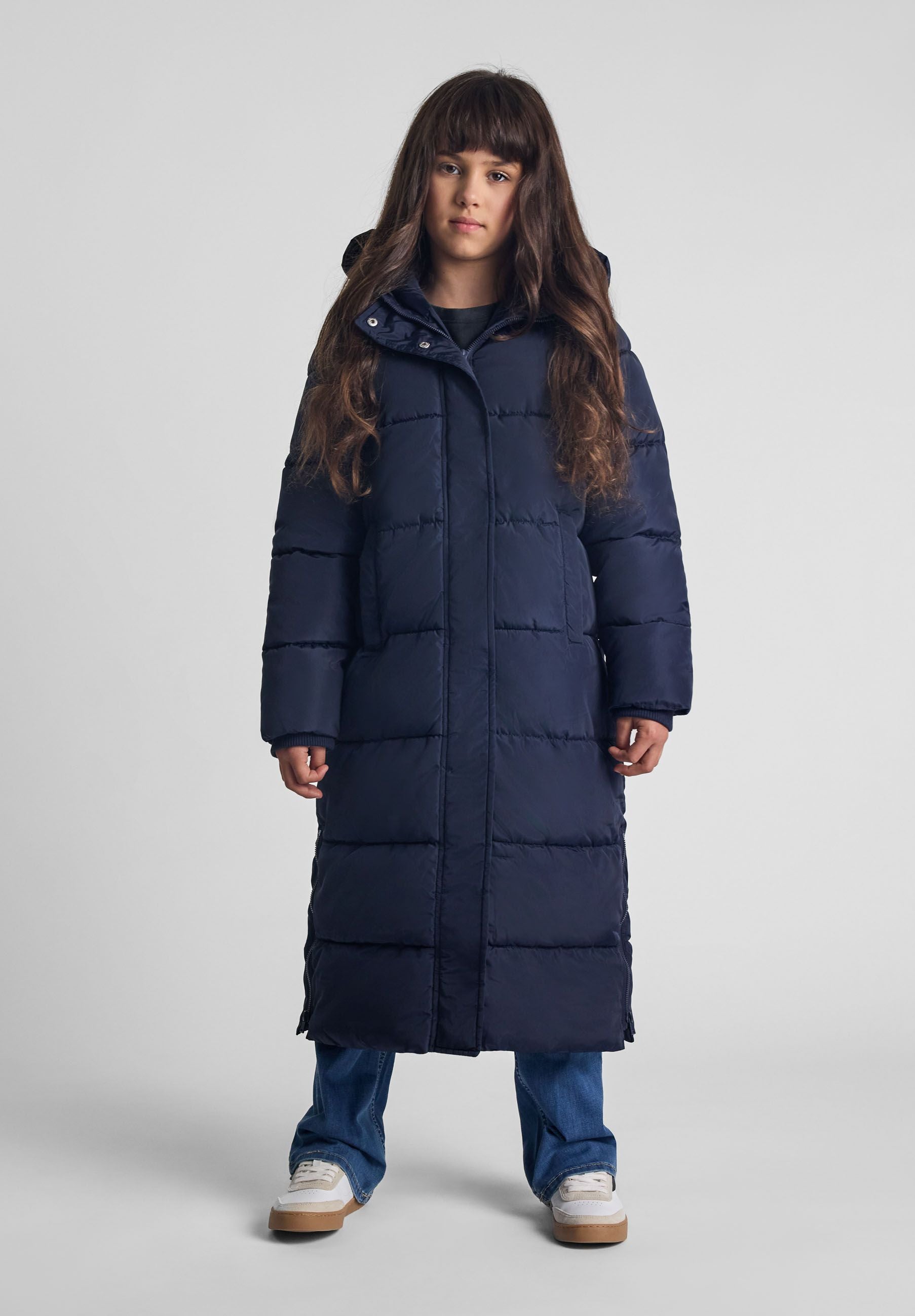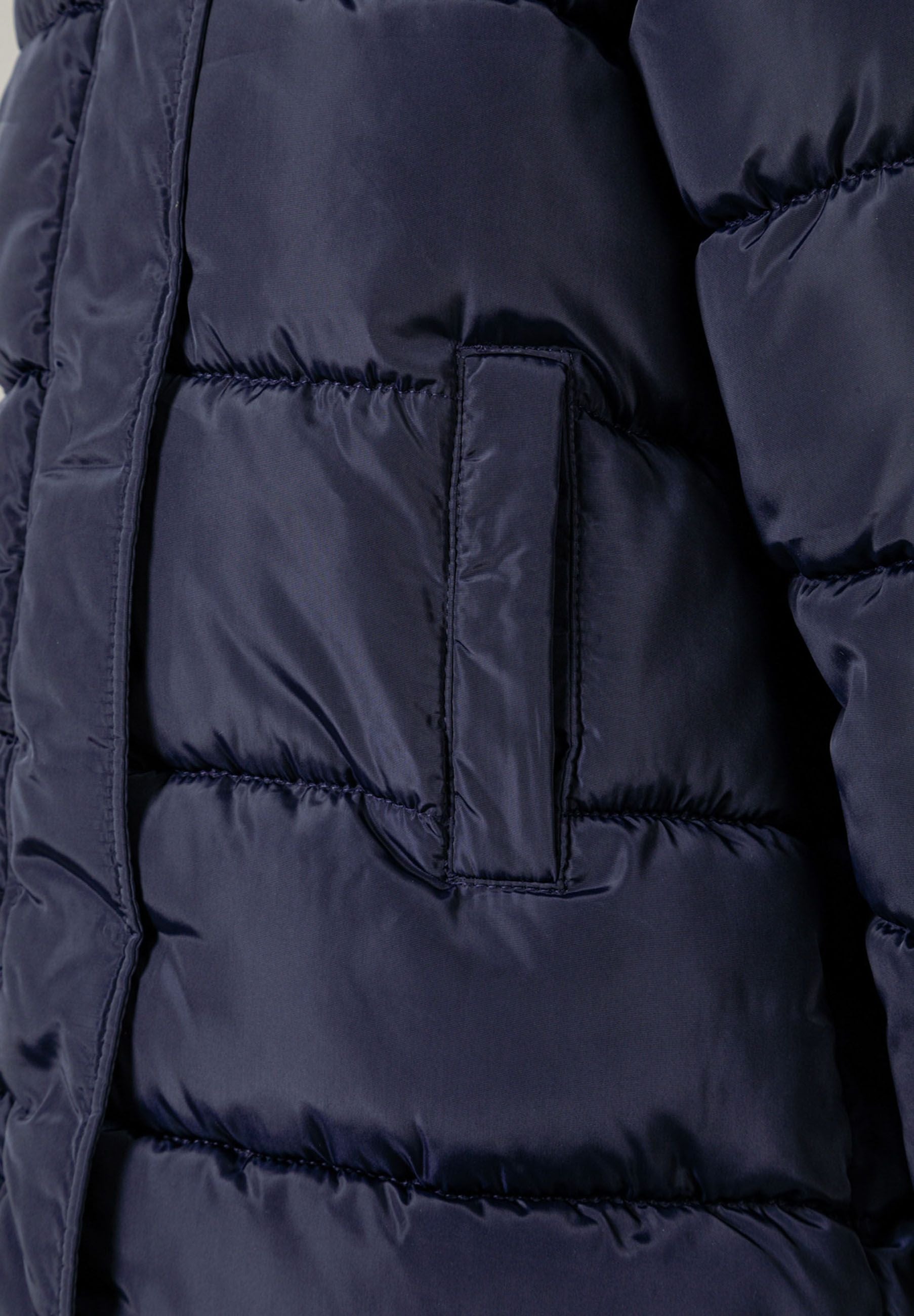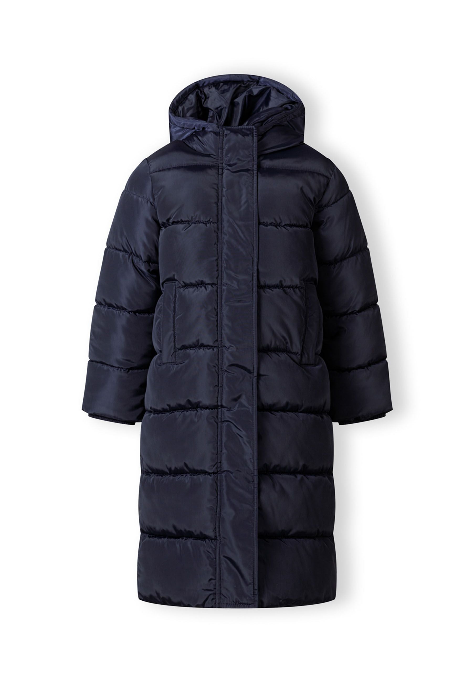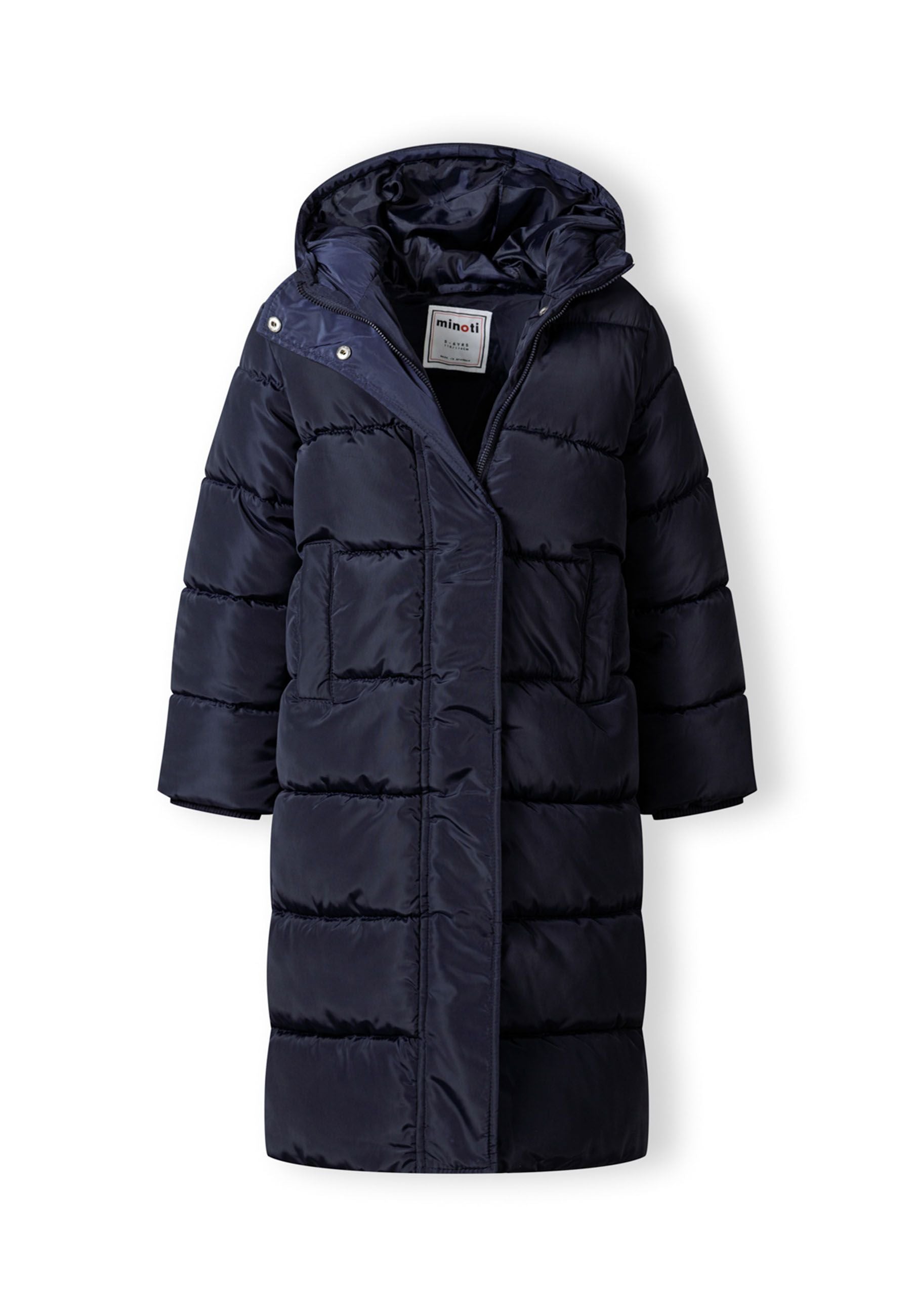 Lange gefütterte navyblaue jacke mit kapuze und taschen 2-14 j