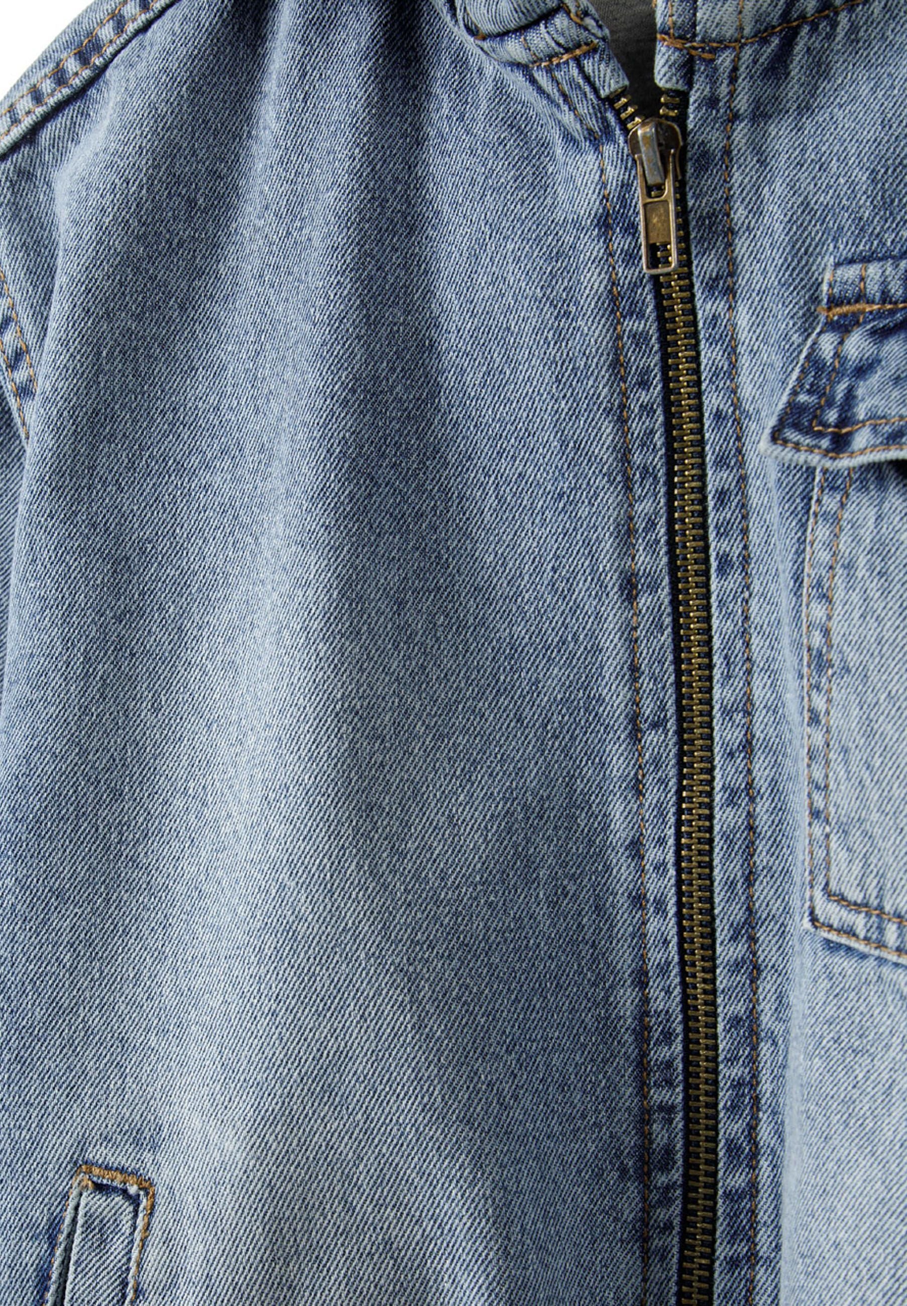 Eine klassisch geschnittene Jeansjacke mit praktischem Reißverschluss und fester Kapuze. Die offene Brusttasche vorne sorgt für einen lässigen Look, während die seitlichen Einschubtaschen für Funktionalität sorgen. Gerippte Bündchen und Saum sorgen für eine bequeme Passform und hohen Tragekomfort. Perfekt für den Alltag und zum Kombinieren über mehrere Lagen.