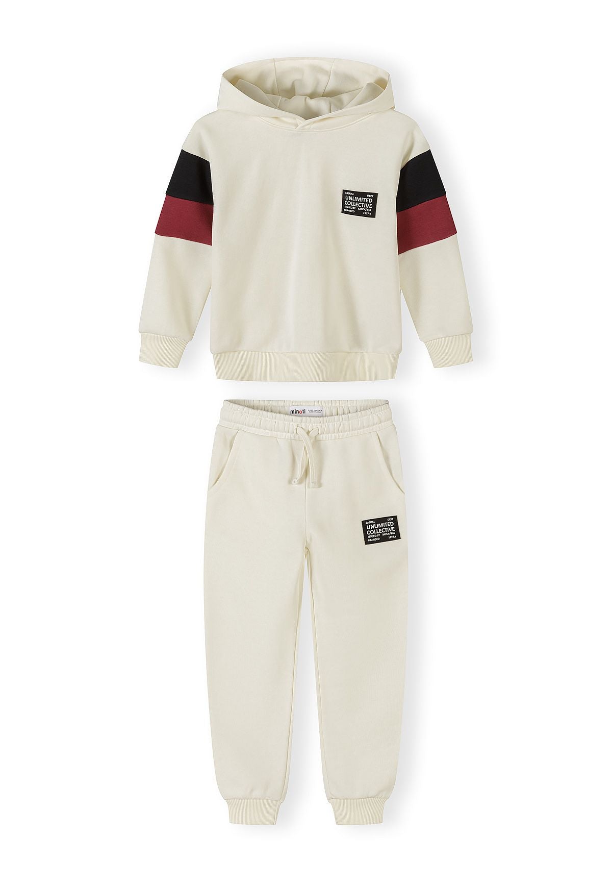 Dieser Jungen-Sweatanzug mit Kapuze präsentiert sich in Cremefarbe mit markanten schwarzen und tiefroten Kontrastpaneelen an den Ärmeln und bietet so einen frischen und stylischen Look. Das Hoodie verfügt über einen Rundhalsausschnitt mit Kapuzenkragen und gerippte Bündchen, während die Jogginghose einen verstellbaren Bund mit Kordelzug und gerippte Beinabschlüsse für einen sicheren Sitz hat. Sowohl Oberteil als auch Hose sind mit Seitentaschen und gebrandeten Patch-Details für zusätzlichen Charme ausgestattet. Hergestellt aus einem robusten Baumwoll-Polyester-Mix, bietet dieser Trainingsanzug Komfort und Funktionalität für aktive Jungen im Alter von 3 bis 15 Jahren und eignet sich ideal für den täglichen Freizeitlook.
