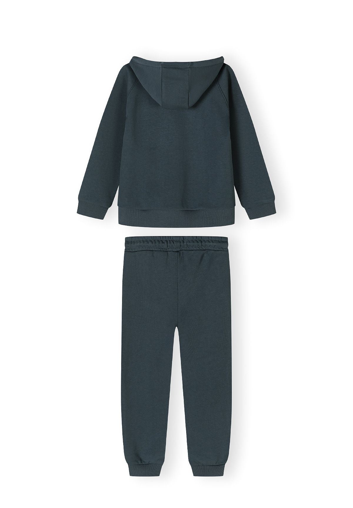 Ensemble bestehend aus einem hoodie und einer hose, speziell für jungen. hergestellt aus weichem, elastischem material, bietet es hohen tragekomfort. die farbgebung ist in einem olivgrünen farbton gehalten. der hoodie hat eine kapuzenkonstruktion, einen halben hohen ausschnitt mit einem kurzen reißverschluss und lange ärmel, die mit bündchen abgeschlossen sind. auf der vorderseite befinden sich zwei kängurutaschen, und auf der linken seite ist ein subtiler stick mit einem logo platziert. die hose hat einen elastischen bund, lange beine, die mit bündchen enden, sowie zwei seitliche taschen. an einem bein befindet sich ein aufnäher mit dem logo. das gesamte set zeichnet sich durch ein einfaches, modernes design aus, das es für verschiedene anlässe geeignet macht. das muster ist einfarbig, was die kombination mit anderen kleidungsstücken erleichtert. ideal für aktive jungen, die komfort und stil schätzen.
