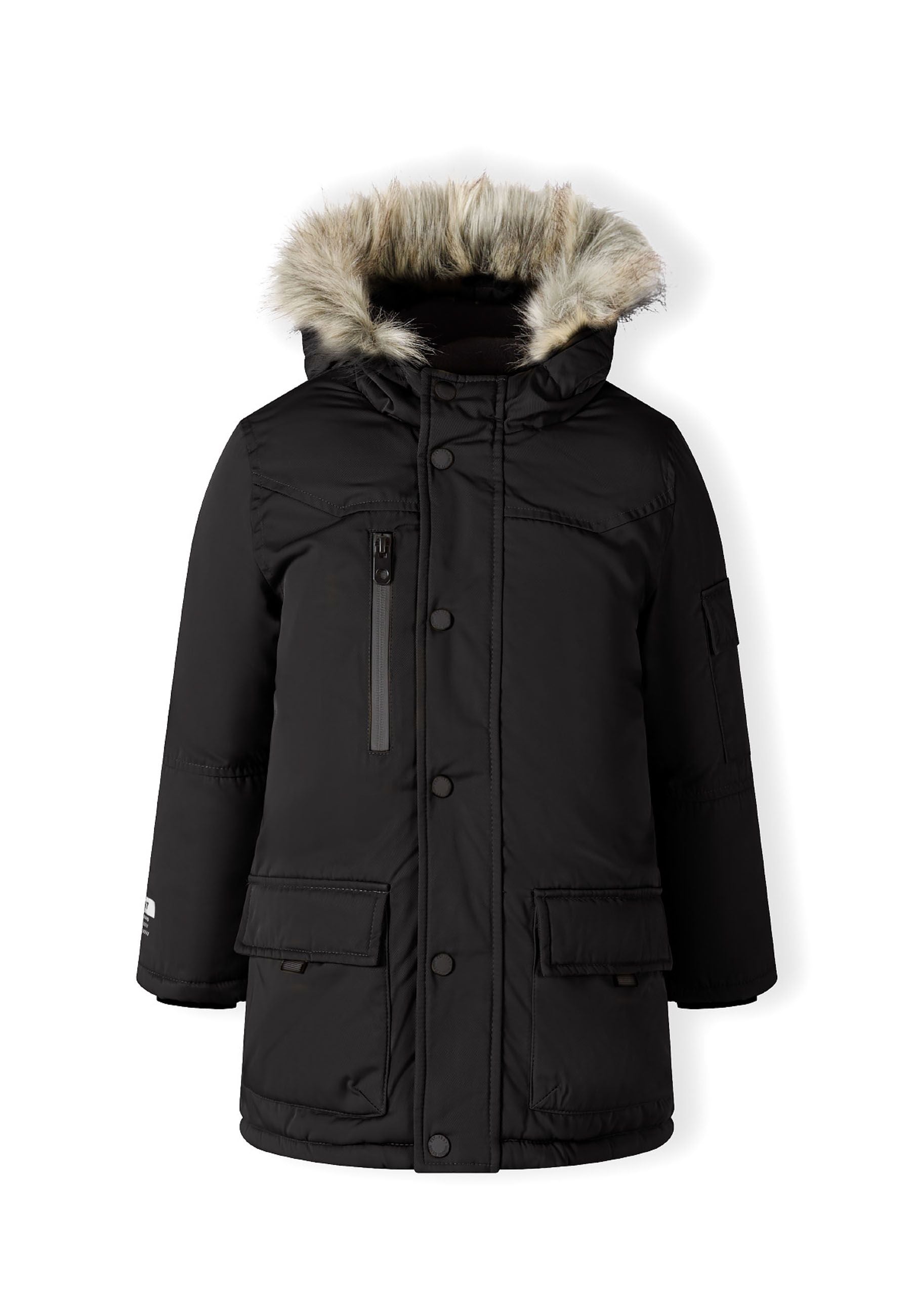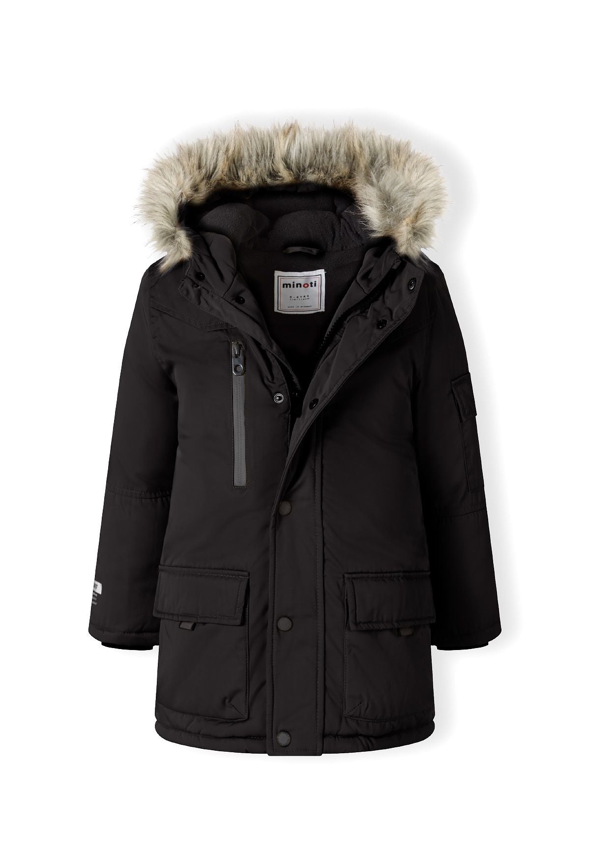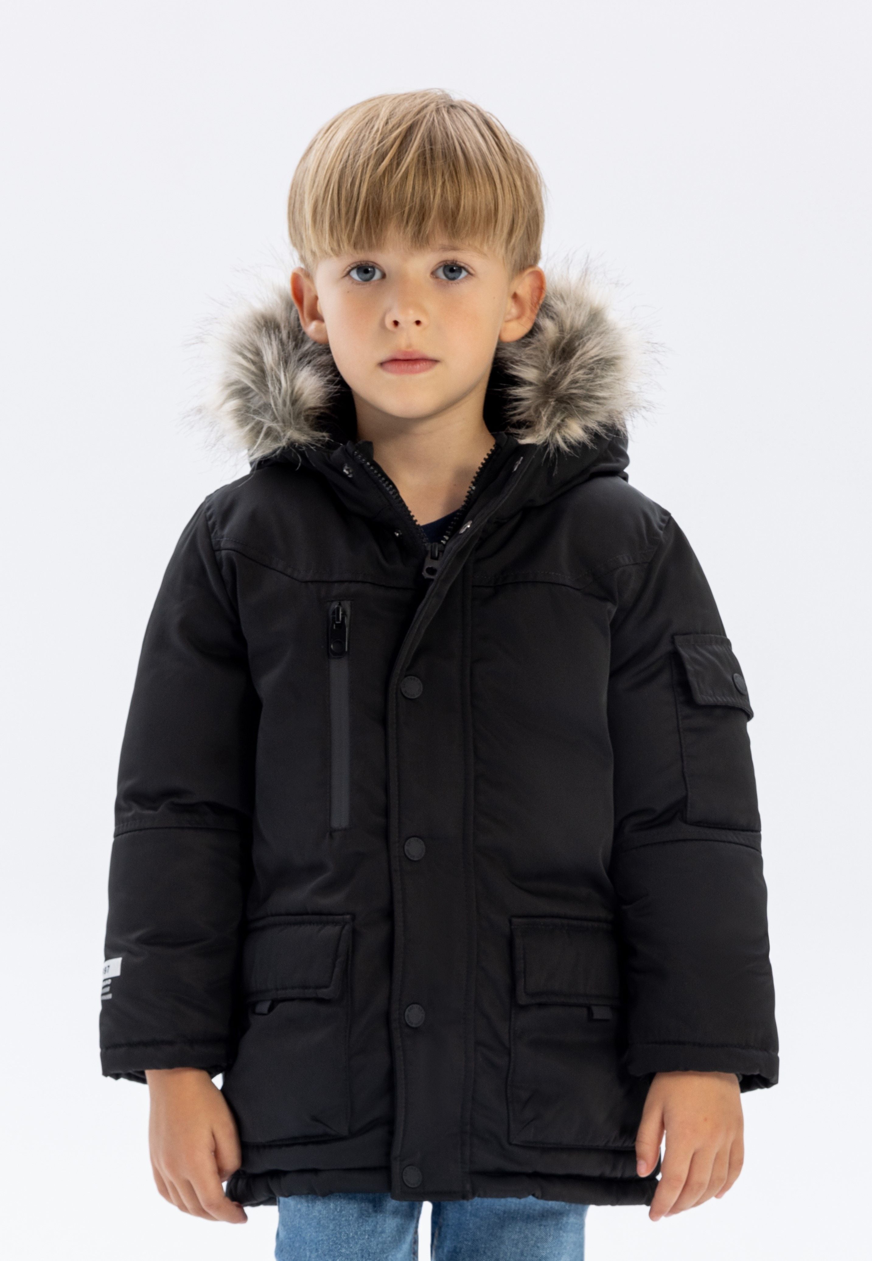 Wärmende jacke für jungen mit kapuze, die mit einem fellbesetzten detail versehen ist, was ihr ein stilvolles aussehen verleiht. das glatte außenmaterial ist pflegeleicht und wetterbeständig. der warme braunton sorgt dafür, dass die jacke zu vielen outfits passt. der hohe kragen bietet zusätzlichen schutz für den hals, während die langen ärmel mit elastischen bündchen helfen, die wärme zu halten. der doppelseitige verschluss mit reißverschluss und knöpfen erhöht die sicherheit und den tragekomfort. die jacke verfügt über eine brusttasche mit reißverschluss sowie zwei große taschen im unteren bereich, die ideal zum verstauen kleiner gegenstände sind. eine zusätzliche kleine tasche am linken ärmel erhöht die funktionalität. die jackenlänge reicht bis zur hüfte, und applikationen sowie stickereien betonen die qualität der verarbeitung. kontrastnähte verleihen ein modernes aussehen, während das weiche innenfutter für tragekomfort sorgt.