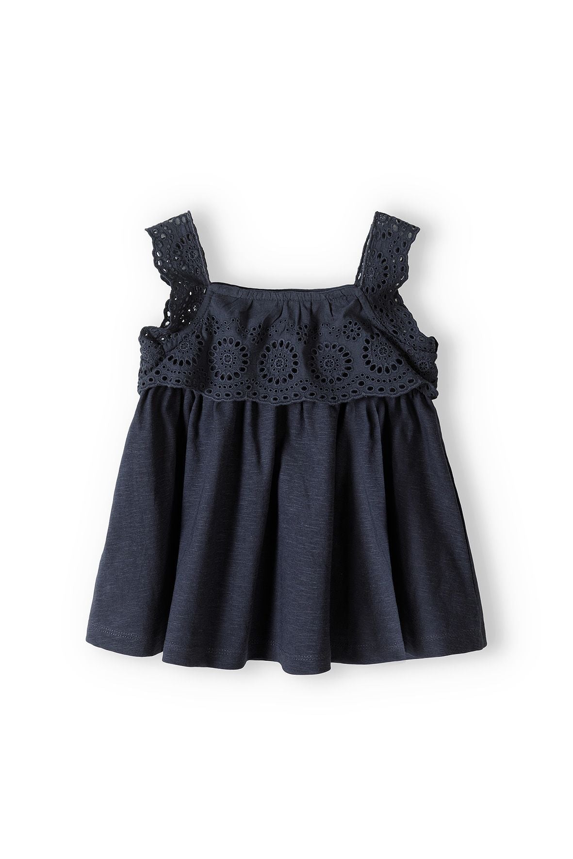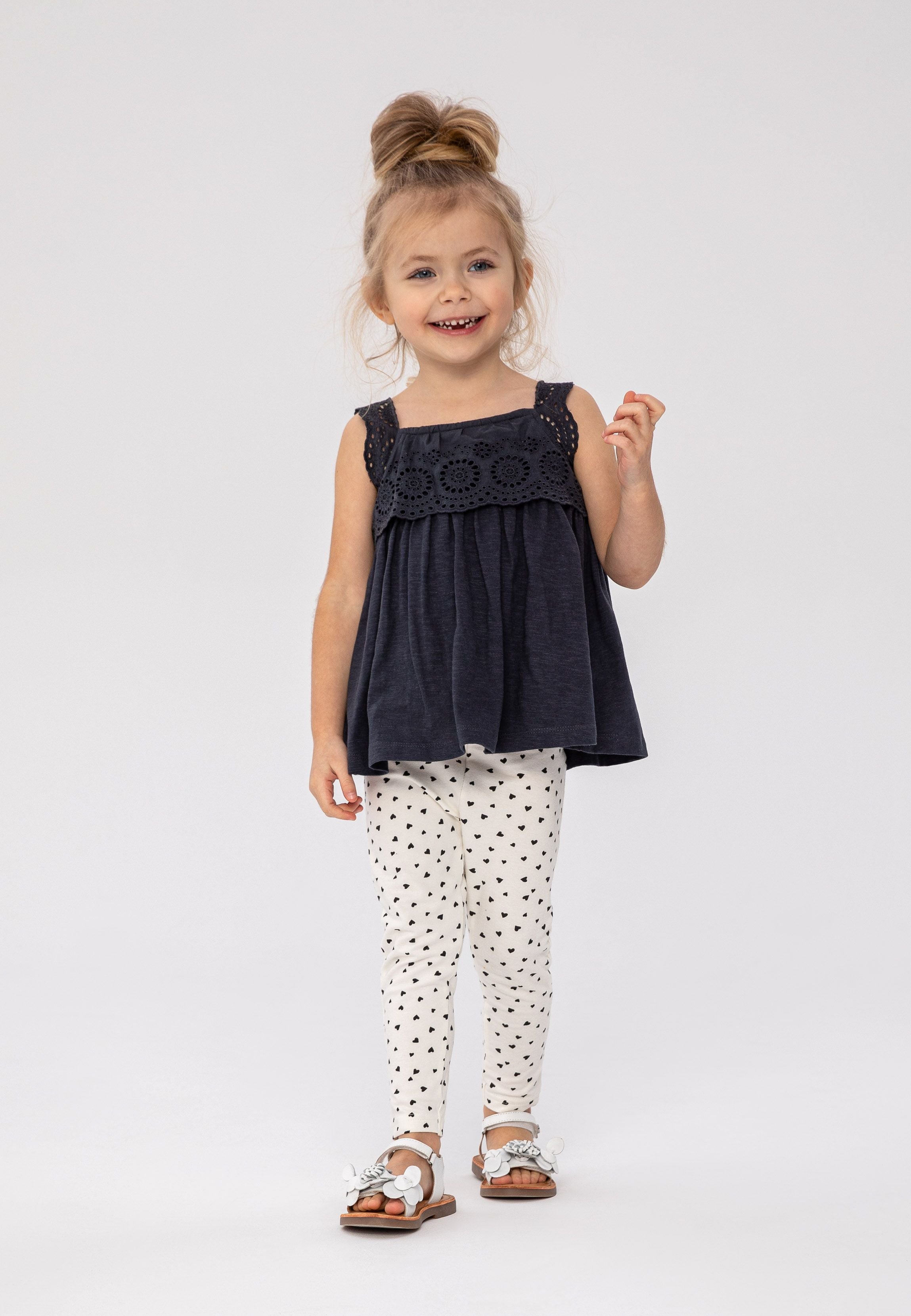 Ensemble bestehend aus einem oberteil und leggings, das für mädchen gedacht ist. das oberteil hat einen lockeren schnitt mit breitem saum und besteht aus weichem material, was hohen tragekomfort bietet. der obere teil des oberteils ist mit einer spitzenapplikation verziert, die ein auffälliges muster mit runden öffnungen erzeugt. breite träger sorgen für stabilität, während der rechteckige ausschnitt die zartheit der konstruktion betont. die leggings in heller farbe mit einem feinen, schwarzen herzmuster bringen ein verspieltes element ein. sie sind aus elastischem material gefertigt, das bewegungsfreiheit gewährleistet, und der elastische bund erleichtert das anziehen. die länge des oberteils reicht bis zur hüfte, was das ensemble ideal für wärmere tage macht. die ärmel des oberteils sind ärmellos, was den sommerlichen charakter der kleidung unterstreicht. der klassische schnitt der leggings schmiegt sich an den körper und sorgt für komfort. das gesamte ensemble ist in einer dezenten farbgebung gehalten, mit einem dominierenden dunkelblauen farbton des oberteils und einem hellen hintergrund der leggings.