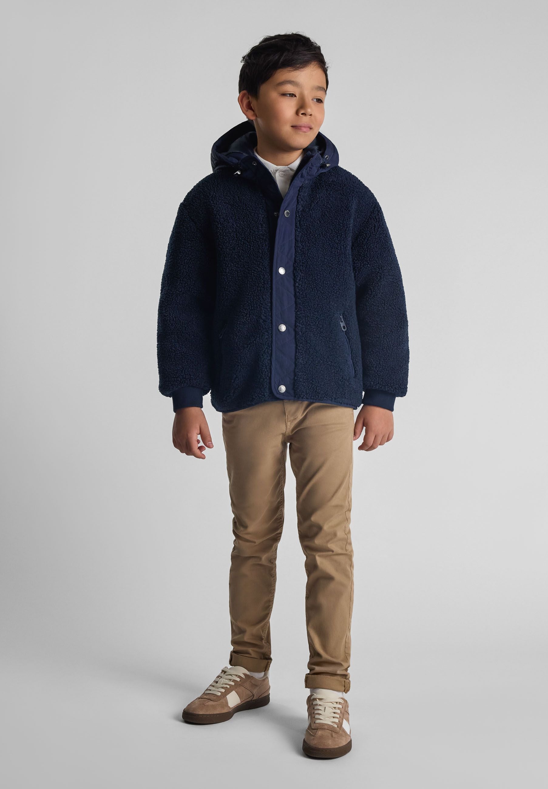 Diese Jacke mit Borg-Struktur verfügt über ein gestepptes Futter für Struktur und Wärmeisolierung. Sie wird mit einem verdeckten Reißverschluss unter einer doppelten Knopfleiste mit Druckknöpfen mit Logo-Prägung geschlossen. Der hohe Stehkragen schützt den Hals und verfügt über einen Reißverschlussschutz unter dem Kinn. Die verdeckte Kapuze ist mit dekorativen Details und funktionalem Besatz versehen. Die Ärmel sind mit elastischen Bündchen für eine bequeme Passform versehen. Seitliche Reißverschlusstaschen bieten Funktionalität und Sicherheit.