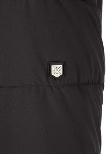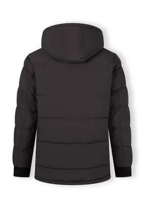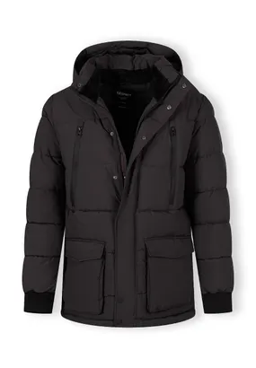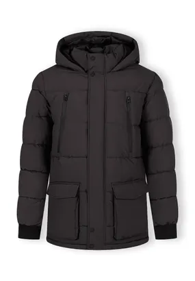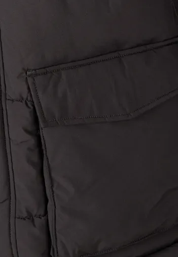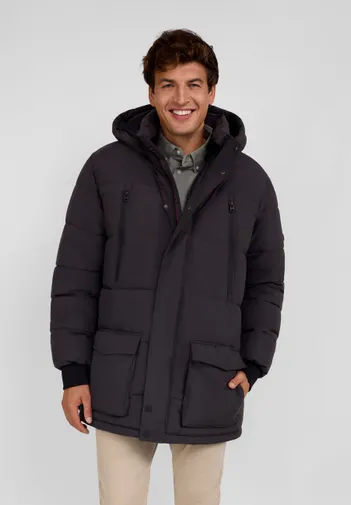 Quilted parka with a longer silhouette and fleece inner lining, designed for extra coverage and comfort. Features a fixed hood, high collar, and full-length zip concealed beneath a snap-button placket. Practicality comes from two chest pockets with waterproof zips, two flap pockets with side hand-entry underneath, and elasticated cuffs. Grosgrain stitch detailing on the hood and a sleeve badge complete the look.