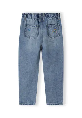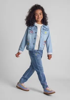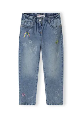 These jeans with elasticated waist are a perfect everyday choice for kids. They feature playful embroidered and printed elements like stars, hearts, and rainbows, adding personality to a classic cut. The soft, flexible waistband ensures easy wear and all-day comfort, while the relaxed fit allows freedom of movement for active play. Designed for everyday adventures, they combine comfort and fun details to create a stylish, practical piece for any wardrobe.