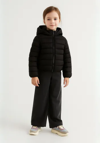 Girl’ quilted jacket in soft features a detachable hood, protective top zipper guard, and lightly padded fabric. The full-length zip closure ensures easy dressing, while the elasticated cuffs keep sleeves in place. Side seam pockets provide practical storage without disrupting the design. The high collar gives extra warmth around the neck, and the sleeve patch adds a playful touch. A stylish, safe, and comfortable choice for active girls.