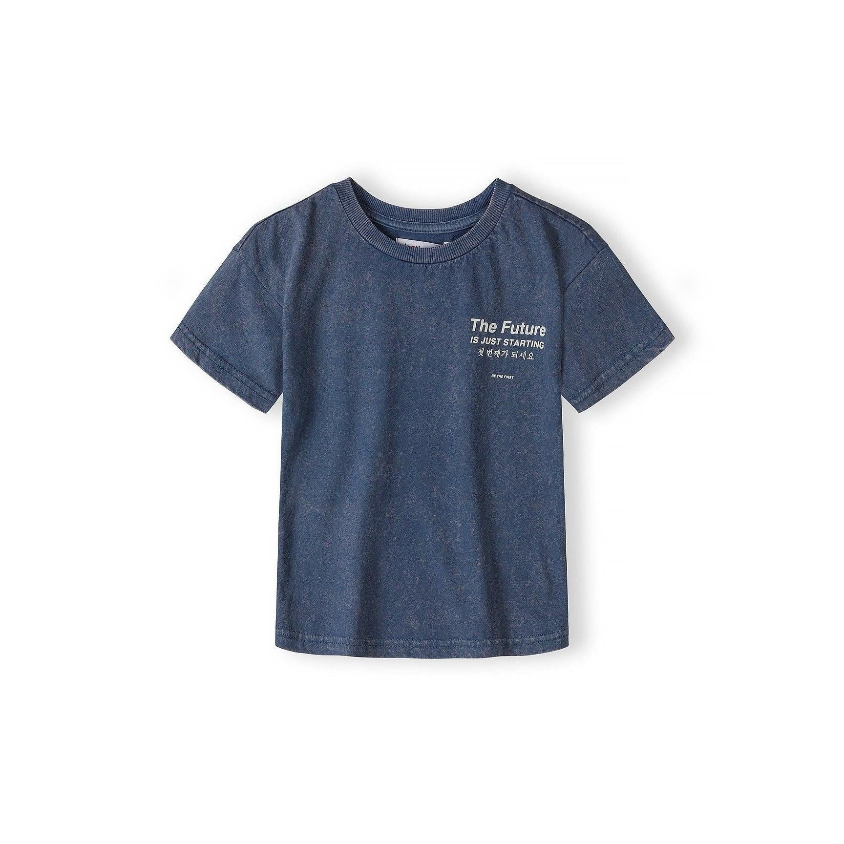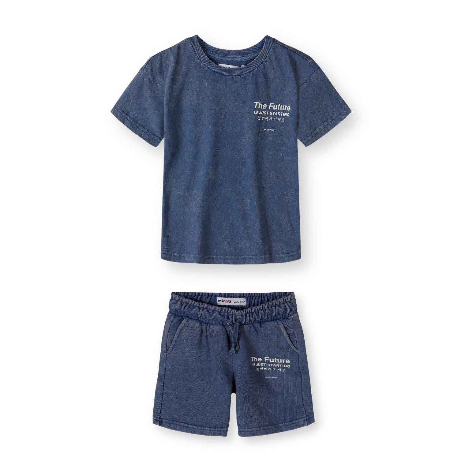 Conjunto elegante para niños que incluye una camiseta de manga corta con pantalones cortos a juego en acabado azul acid wash, diseñado para edades de 3 a 15 años. Este conjunto cómodo es perfecto para el clima cálido y el juego activo, combinando estilo con practicidad.