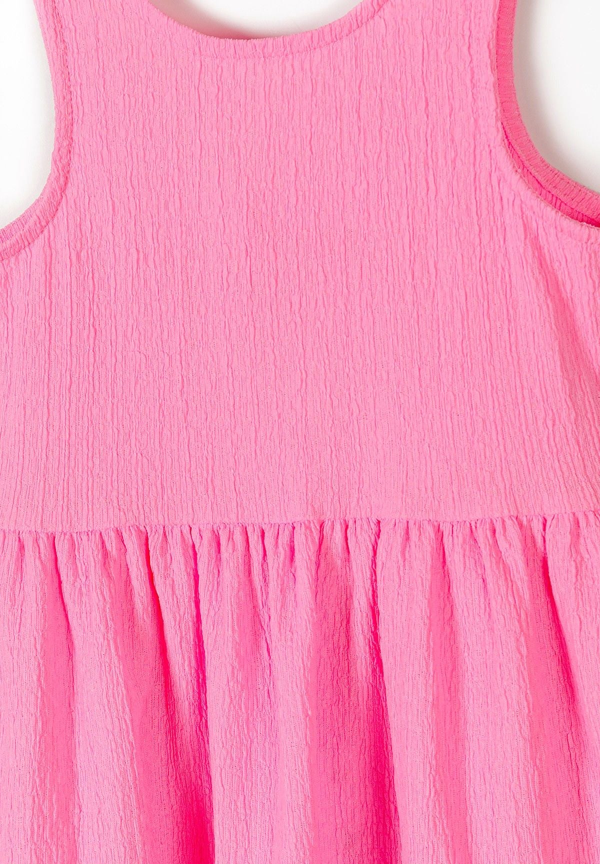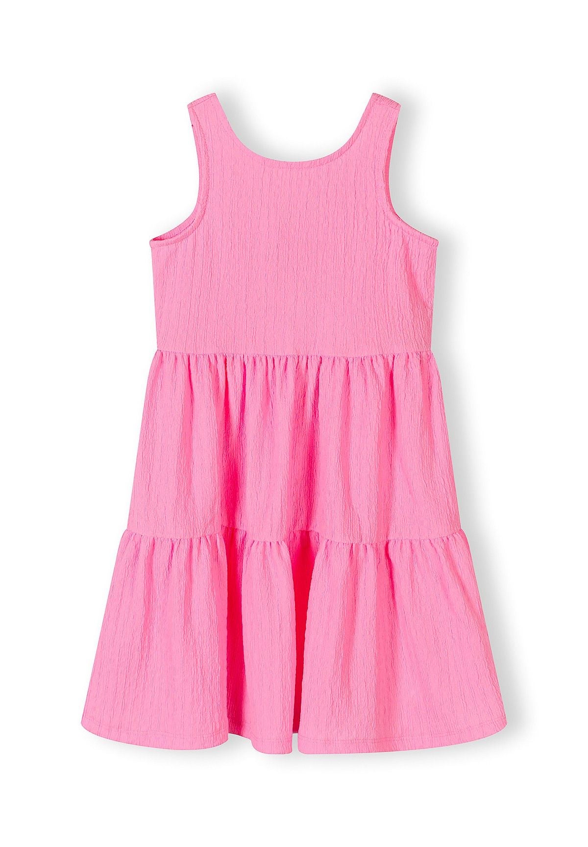 This sleeveless summer dress combines youthful aesthetic with functional details, designed for girls aged 3 to 15 years. Perfect for warm weather, featuring tiered layers that enhance ventilation helping to keep the child cool. The adjustable back drawstring allows for a personalised fit ensuring unrestricted movement while playing, while the vibrant pink colour and smooth texture create an everyday summer option offering ease and style.