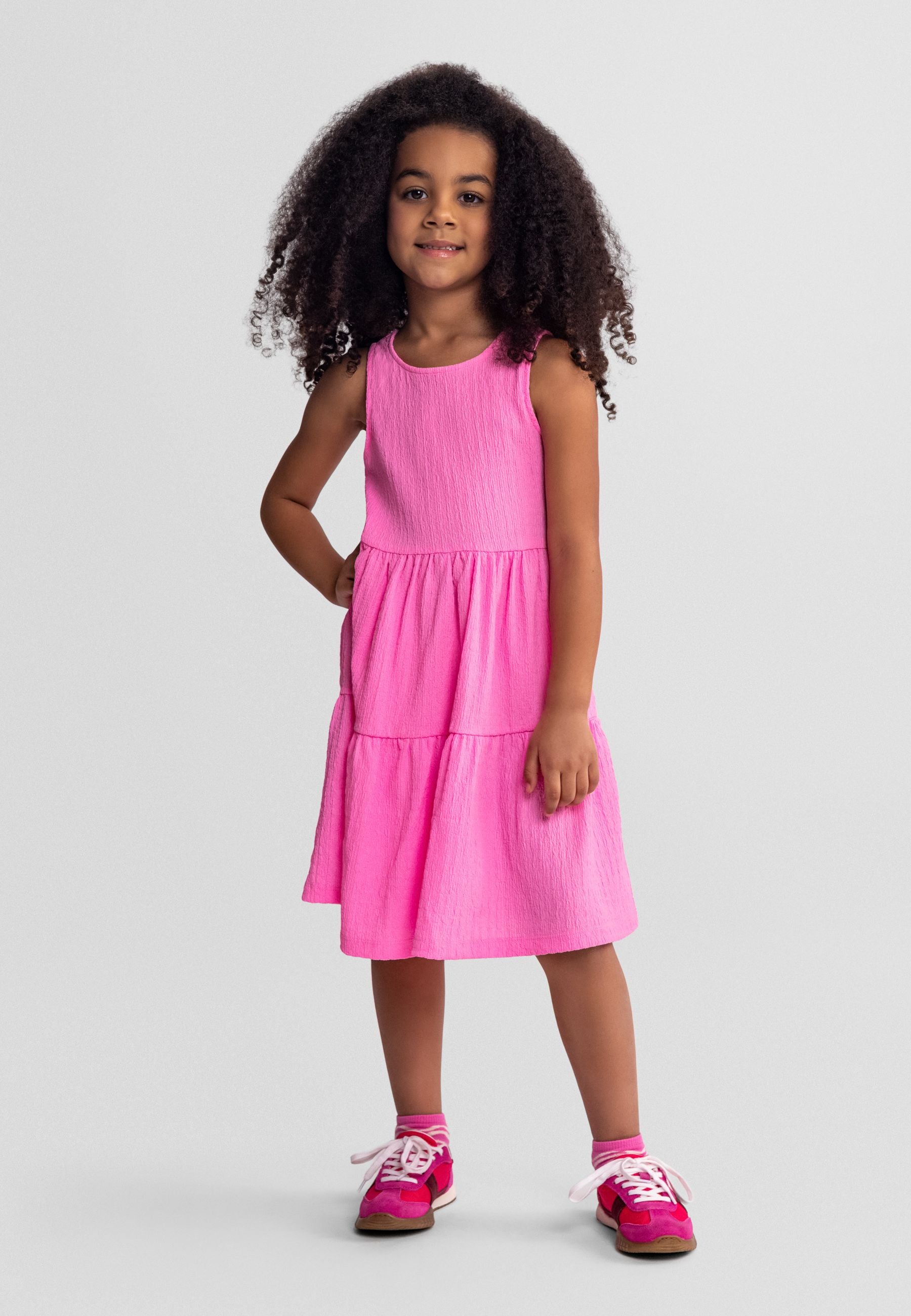 Parents appreciate the combination of youthful aesthetic and functional details in this pink tiered summer dress. The tiered layers enhance ventilation, helping to keep the child cool during warm weather activities and play. The adjustable back drawstring allows for a personalised fit, ensuring unrestricted movement while playing and adapting as girls grow. Made from a lightweight blend of polyester and elastane, the fabric provides a slight stretch for comfortable, active wear. The fabric retains its vibrant pink colour and smooth texture after multiple washes, ensuring long-lasting beauty. This dress offers ease and style in an everyday summer option, featuring a back fastening, regular fit, straight shape, and crew neck perfect for girls aged 3 to 15 years.