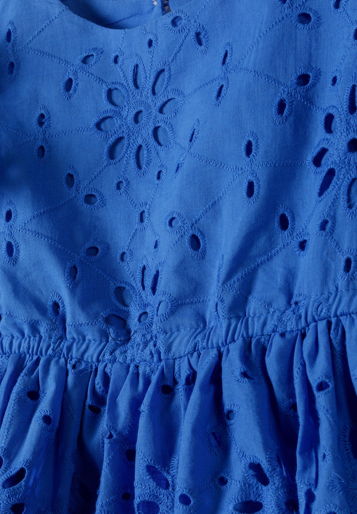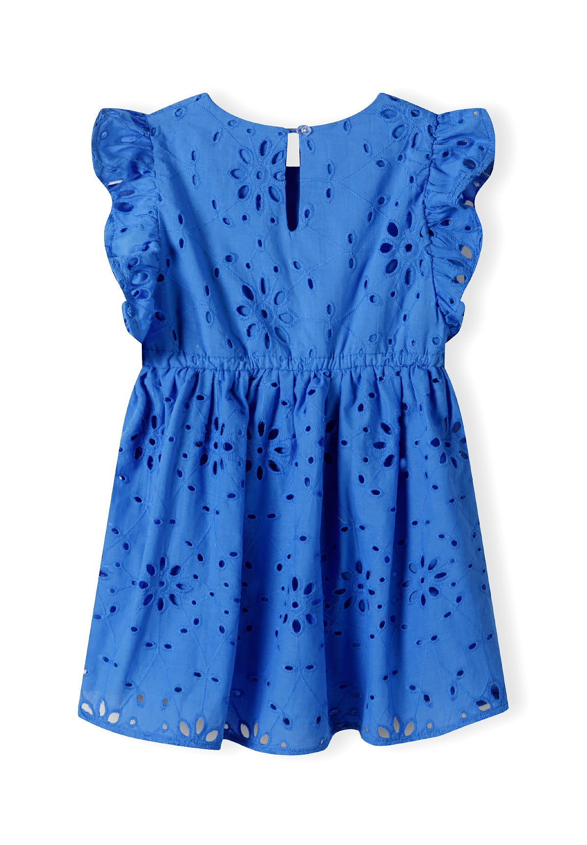 Girls' dress in a vibrant blue shade, crafted from lightweight cotton fabric with decorative broderie anglaise detailing. The all-over embroidered pattern with cut-out elements adds beautiful texture and visual interest while maintaining breathability — a well-balanced combination of detailed craftsmanship and practical design for everyday use.