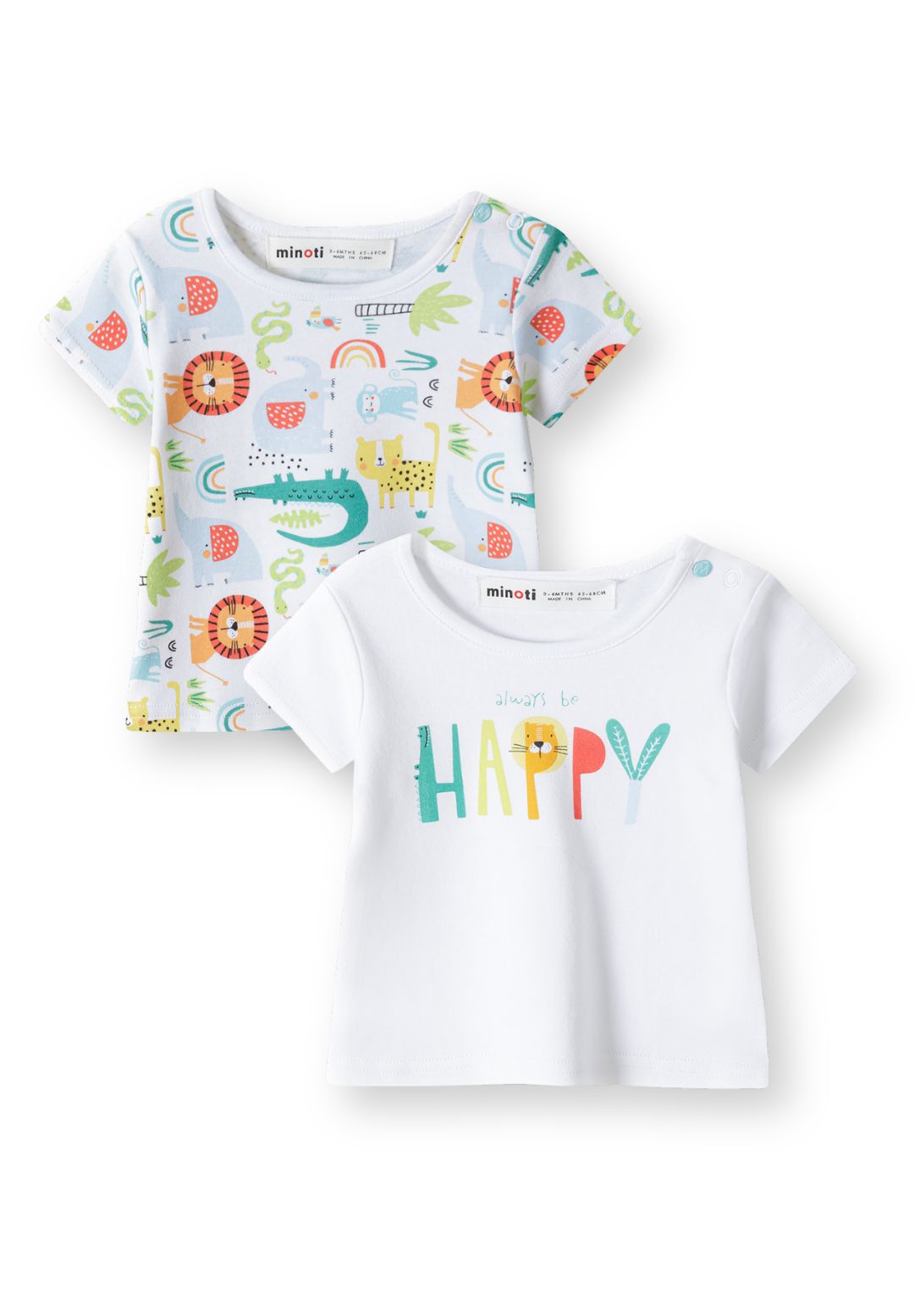 Un pacco da due t-shirt a maniche corte progettate per neonati, ciascuna con un colore di base bianco. Una t-shirt è decorata con audaci strisce orizzontali in tonalità scure e chiare a contrasto, mentre l'altra presenta slogan stampati in un carattere chiaro e leggibile, offrendo due opzioni di design distinte. Entrambe le t-shirt hanno scollature a girocollo a costine e una vestibilità regolare per garantire una comoda libertà di movimento. I bottoni a pressione sulle spalle, posizionati sulla scollatura, permettono una pratica facilità per vestirli e cambiarli. Progettate per le stagioni più calde, queste t-shirt fanno parte di una collezione coordinata e si abbinano bene con altri capi della linea adventure. Il tessuto morbido in cotone offre traspirabilità e comfort adatti alla delicata pelle del bambino, supportando l'uso per tutto il giorno mantenendo una cura delicata durante il clima più caldo.