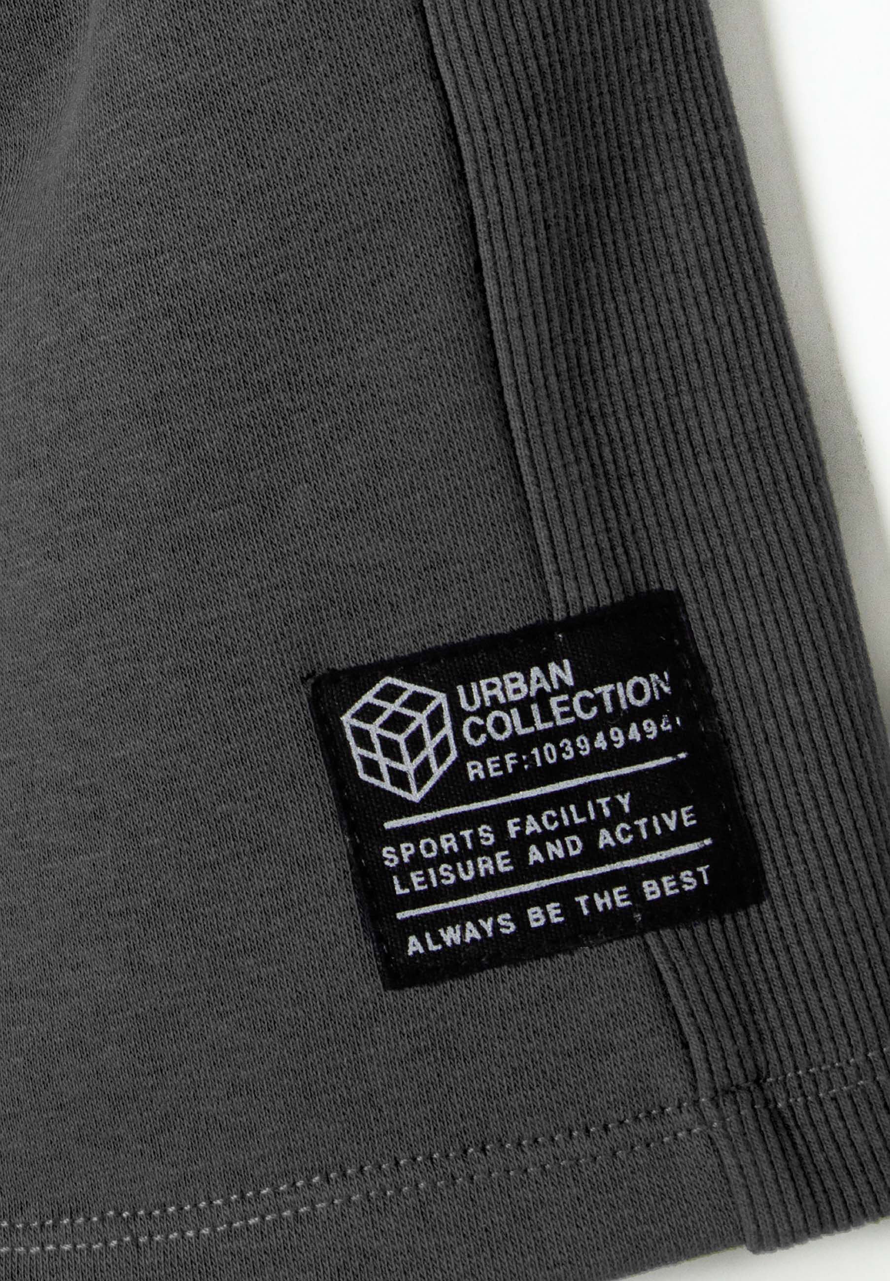 Boys fleece shorts crafted for everyday comfort and active wear incorporate a soft fleece fabric that delivers warmth alongside a cosy feel. the main colour is a versatile grey, complemented by ribbed fabric panels on the sides which introduce a subtle texture and added visual interest. the elasticated waistband is equipped with adjustable drawstrings, providing a tailored and secure fit throughout various activities. practical design elements include two side pockets for easy storage of small essentials. a prominent decorative patch located on one leg contributes a distinctive stylistic detail. the relaxed fit is designed to promote freedom of movement, making the shorts suitable for casual occasions or outdoor activities. construction quality focuses on durability and ease of maintenance to support frequent use and long-lasting wear.