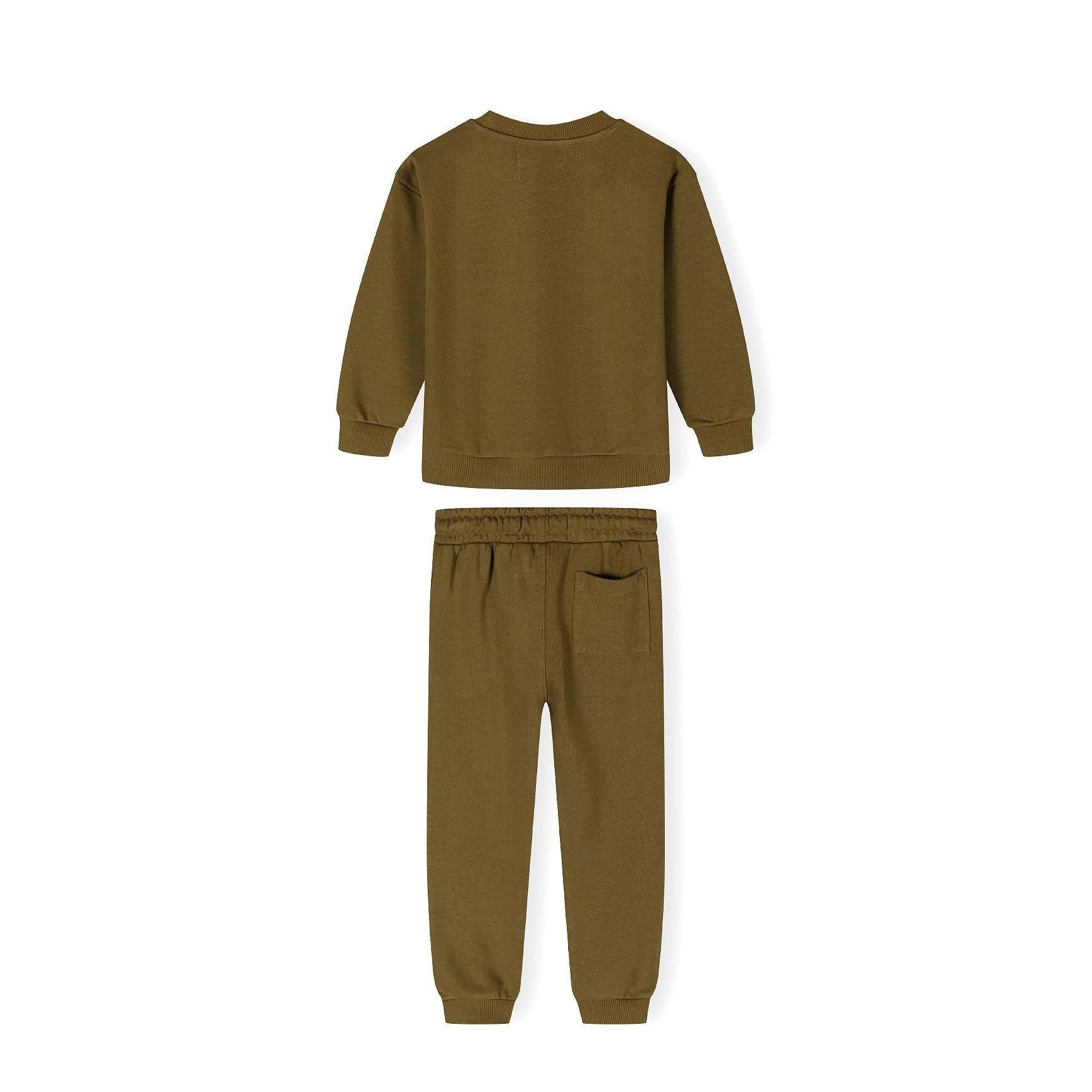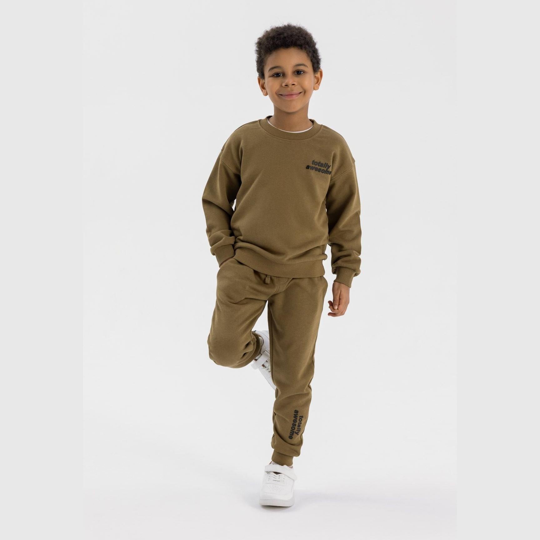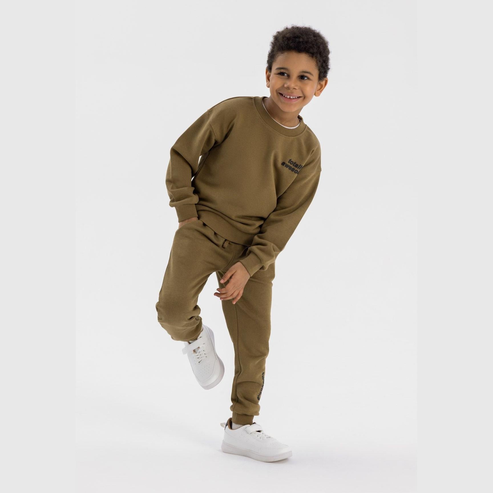 Een jongenskledingset bestaande uit een bruin sweatshirt met ronde hals en bijpassende joggers, ontworpen voor dagelijks gebruik. Het sweatshirt heeft een geribde ronde halslijn met elastische manchetten en zoom, wat zorgt voor een comfortabele en flexibele pasvorm die actief bewegen mogelijk maakt. De joggers zijn voorzien van een elastische tailleband met trekkoorden voor een aangepaste pasvorm, naast zijzakken die handig opbergruimte bieden. Elastische pijpboorden zorgen ervoor dat de joggers tijdens activiteiten goed op hun plaats blijven zitten. Gemaakt van lichtgewicht katoenen fleece, combineert de set ademend vermogen met zachtheid, wat comfort biedt dat geschikt is voor casual uitstapjes of licht spel. Het ontwerp richt zich op functionaliteit, ondersteunt bewegingsvrijheid en garandeert duurzaamheid bij regelmatig gebruik zonder in te leveren op comfort.