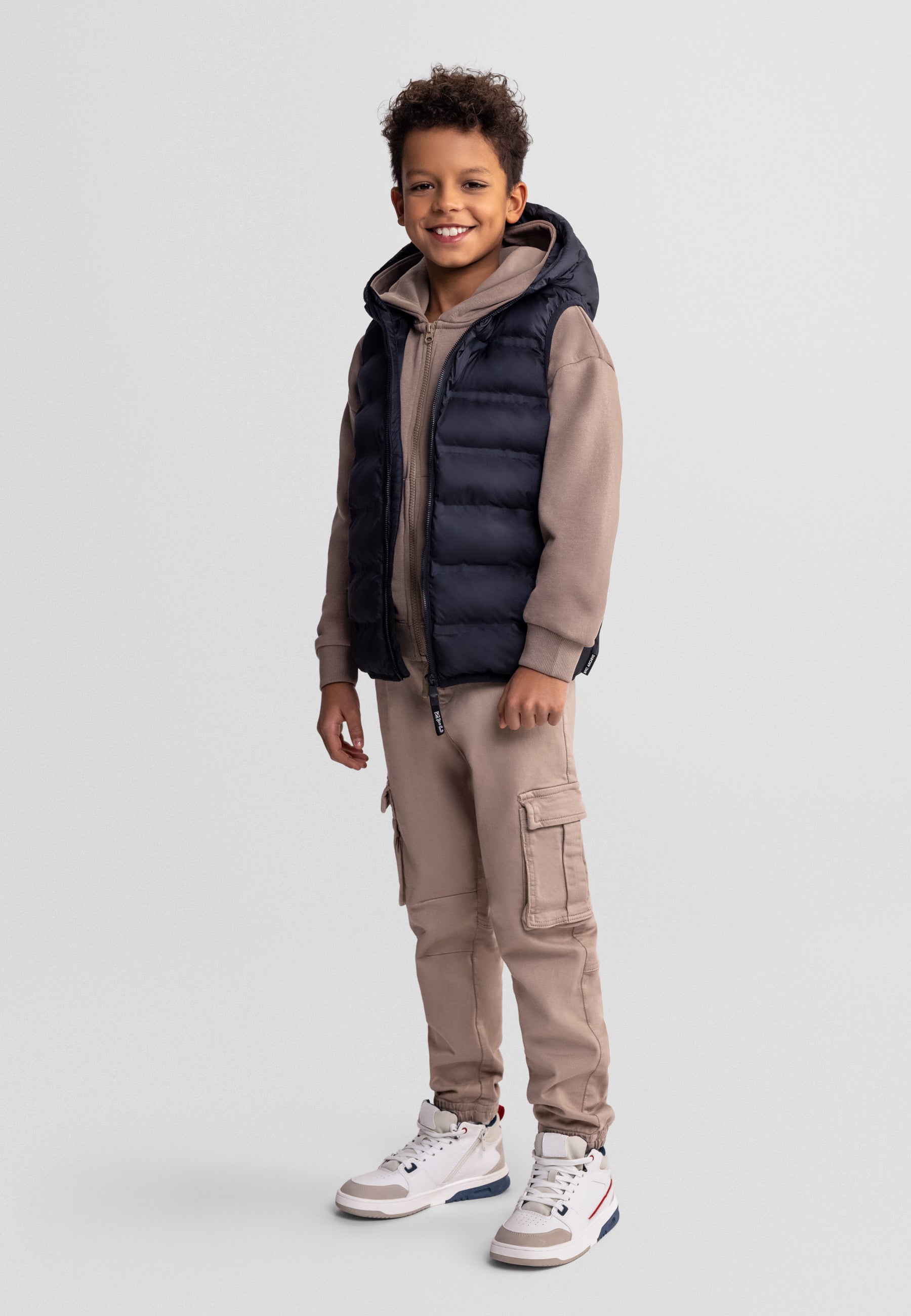 This boys' quilted waistcoat in classic black offers lightweight warmth combined with practical design, crafted entirely from durable polyester for easy care and lasting wear. Featuring a sleeveless cut with an attached lined hood and full-length front zipper, it provides comfort and unrestricted movement during transitional seasons.