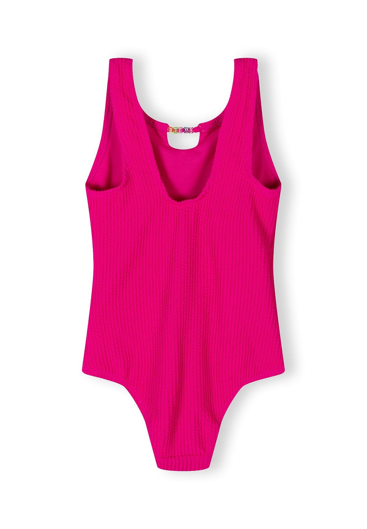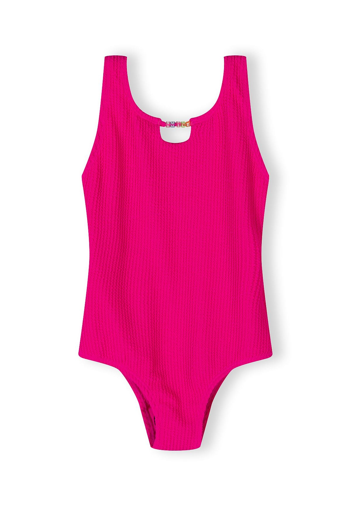 This girls pink swimsuit showcases a vivid pink hue combined with delicate pearl detailing at the neckline, providing a touch of refined elegance. Perfect for girls aged 3-11 years, this stylish swimsuit is ideal for pool parties, beach holidays, and summer water activities.