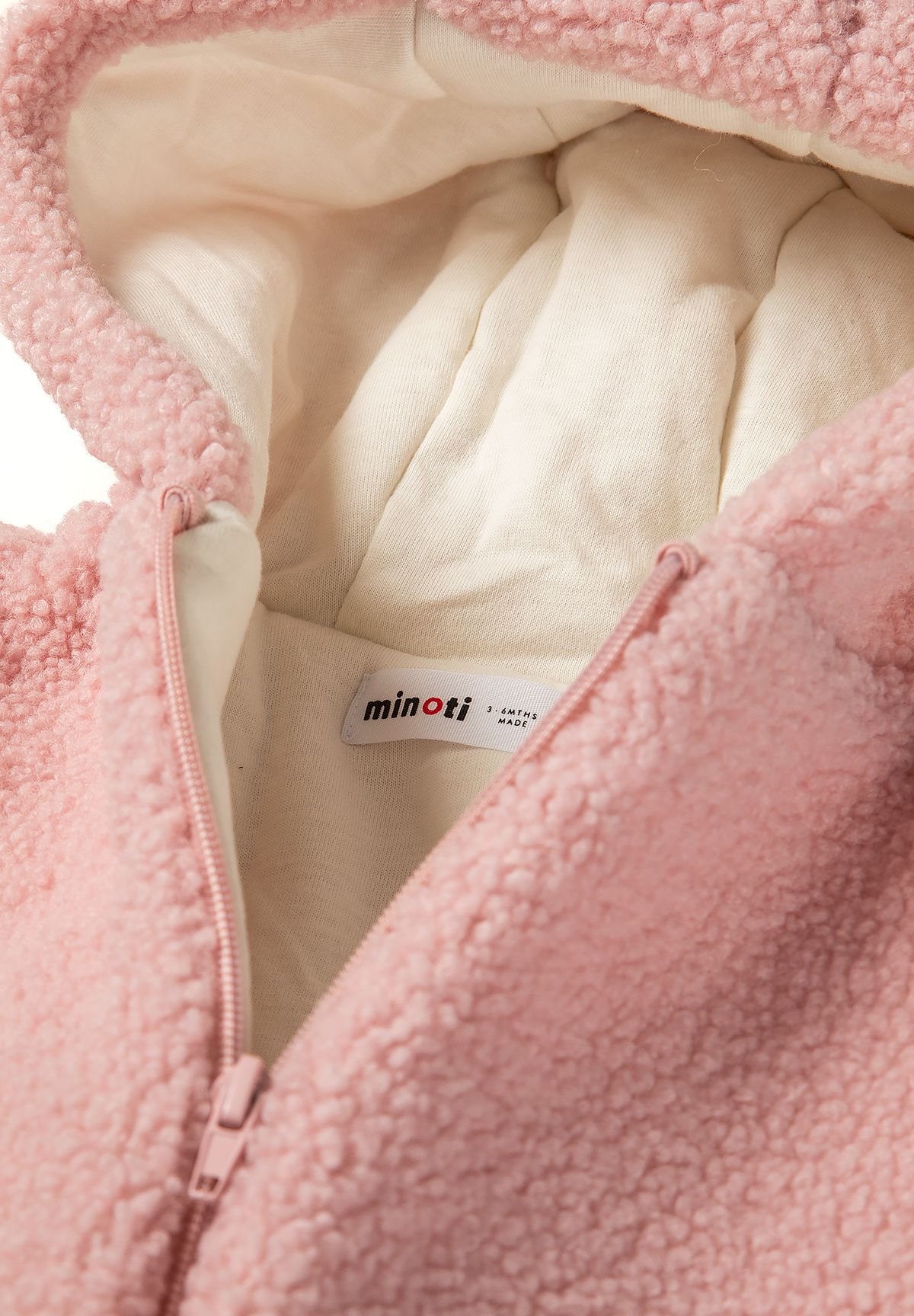 Dziewczęcy kombinezon zimowy z sherpy to jednoczęściowa odzież wierzchnia starannie zaprojektowana, aby zapewnić doskonałe ciepło i ochronę przez cały okres zimowy. Prezentuje się w uroczej jasnoróżowej barwie oraz wyjątkowo miękkiej fakturze sherpy, która pokrywa cały kombinezon, oferując przytulne i zachęcające uczucie. Wbudowana podszewka wykonana z oddychającej bawełnianej dzianiny jersey zapewnia komfortową izolację, czyniąc go idealnym wyborem na chłodne dni. Praktyczny przedni zamek błyskawiczny umożliwia łatwe ubieranie i zdejmowanie, ułatwiając codzienne czynności rodzicom. Kaptur ozdobiony jest zabawnymi trójwymiarowymi uszkami, wprowadzając wyjątkowy i uroczy element wzorniczy, a jednocześnie zapewnia pełne osłonięcie głowy. Elastyczne ściągacze przy nogawkach zostały umiejętnie wprowadzone, aby zapewnić pewne dopasowanie, skutecznie zatrzymując ciepło i zapobiegając przedostawaniu się zimnego powietrza. Ten kombinezon z sherpy jest wykonany bez dodatkowych wzorów, podkreślając funkcjonalny projekt odpowiadający potrzebom aktywnych maluchów, łącząc luksusową miękkość z praktycznością w jednym ubraniu idealnym do codziennego zimowego użytku.