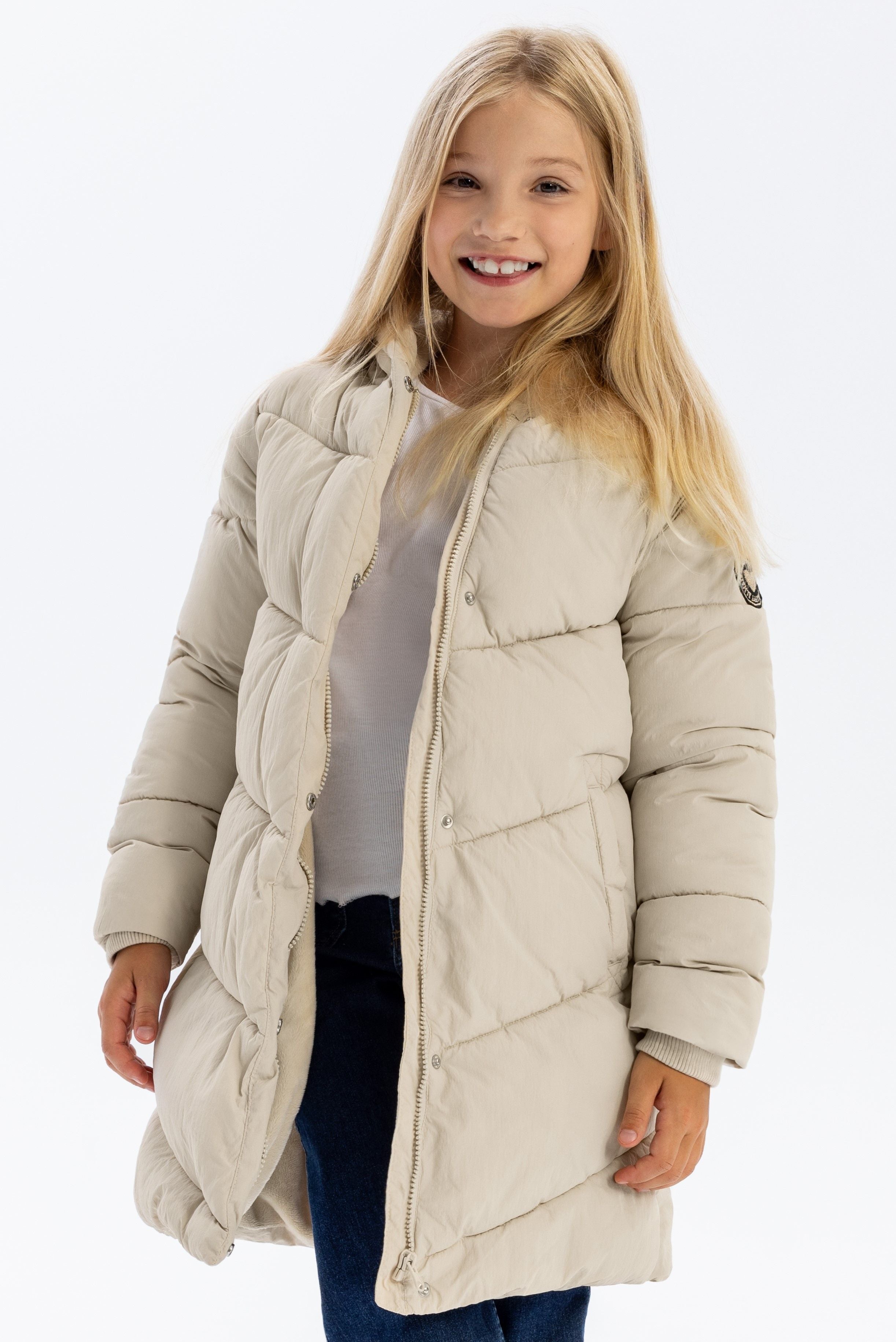 Dziewczęca beżowa pikowana kurtka puchowa z futrzanym kapturem