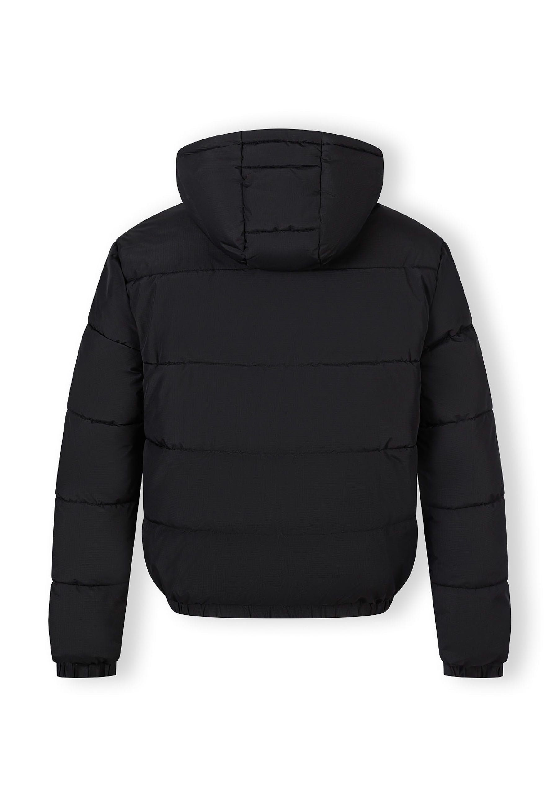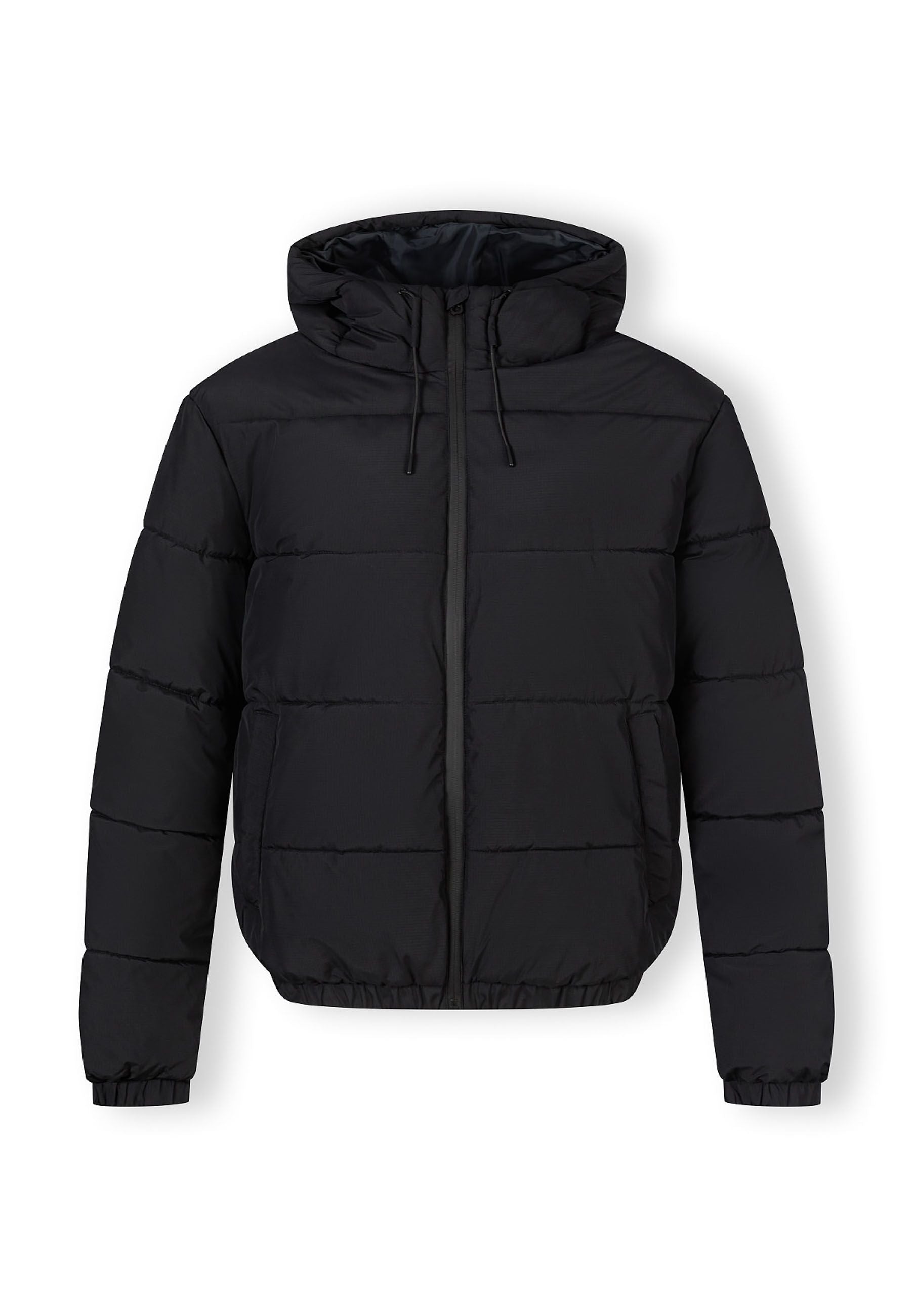Męska kurtka ripstop zaprojektowana jako praktyczna odzież wierzchnia. Skierowana do mężczyzn, kurtka wykonana jest z wytrzymałej tkaniny ripstop, która zapewnia odporność na rozdarcia i trwałość na co dzień. Główny kolor to czarny, o prostym, minimalistycznym kroju i dopasowanym fasonie. Kluczowe cechy konstrukcyjne to wysoki kołnierz oraz regulowany kaptur, które zapewniają dodatkową ochronę przed wiatrem i zmiennymi warunkami pogodowymi. Kurtka ma ściągacze na mankietach i dole, co zapewnia dopasowanie i pomaga zatrzymać ciepło. Posiada przednie kieszenie na zamek, umożliwiające bezpieczne przechowywanie drobnych przedmiotów. Na rękawie znajduje się dyskretna naszywka z logo. Kurtka jest wiatroszczelna, odpowiednia na przejściowe pory roku i różne warunki klimatyczne.