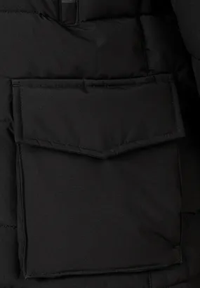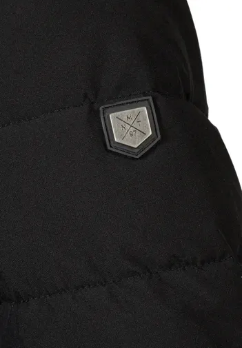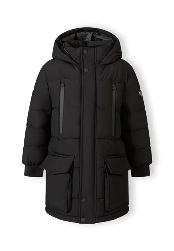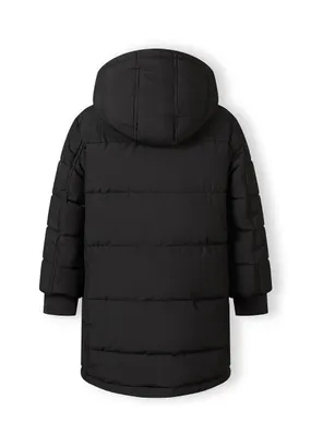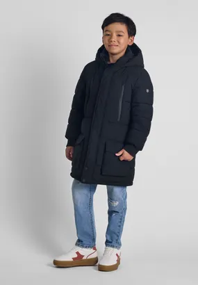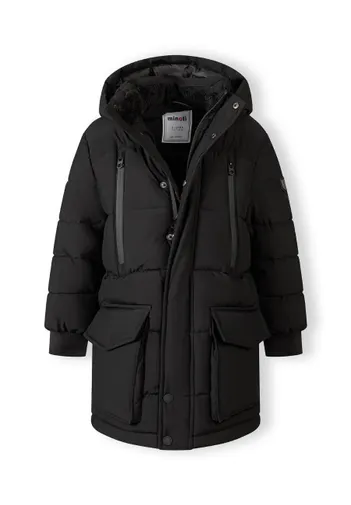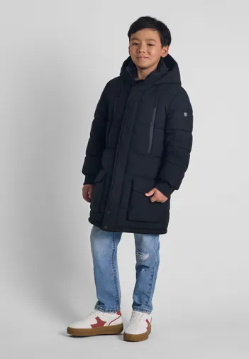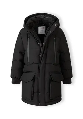 Dłuższa, chłopięca kurtka łączy funkcjonalność z nowoczesnym wyglądem. Zapięcie z przodu to połączenie suwaka i napów. Z przodu znajdują się dwie kieszenie z klapkami oraz dodatkowe ukryte kieszonki pod nimi do ogrzania rąk oraz kieszenie z długimi, wodoodpornymi suwakami. Wnętrze wyściełane miękkim futerkowym materiałem zapewnia komfort. Wysoka stójka oraz kaptur dodatkowo chronią przed zimnem. Stylu dodaje modna,metalowa naszywka na ramieniu.