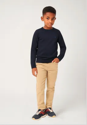 Klasyczny sweter z dzianiny to ponadczasowa propozycja na chłodniejsze dni. Wykonany z miękkiej przędzy z domieszką wiskozy, ma prążkowane wykończenia i okrągły dekolt zapewniający dopasowanie i estetyczny wygląd. Haftowane logo na piersi dodaje wyrafinowanego wykończenia, a regularny krój zapewnia wygodę. Idealny jako warstwa przejściowa lub samodzielny element do swobodnych stylizacji.