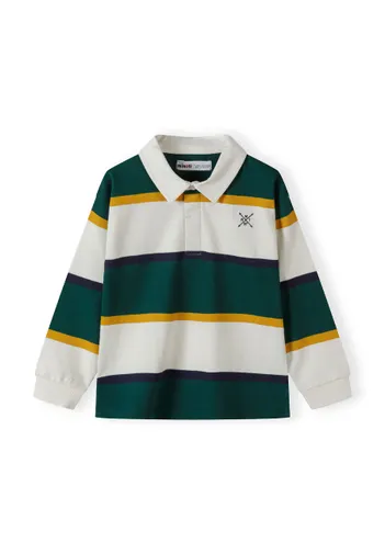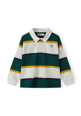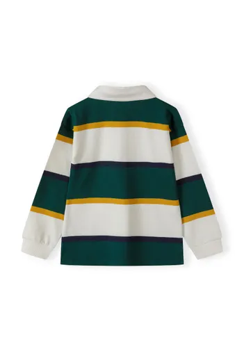 Bluzka z długim rękawem w stylu rugby łączy klasykę ze sportowym wyglądem. Kontrastowy kołnierzyk, ukryte zapięcie i poziome pasy tworzą modną całość. Haft na piersi dodaje subtelnego akcentu. Wygodna, miękka w dotyku i świetna do codziennych stylizacji – do szkoły, na spacer czy weekend.
