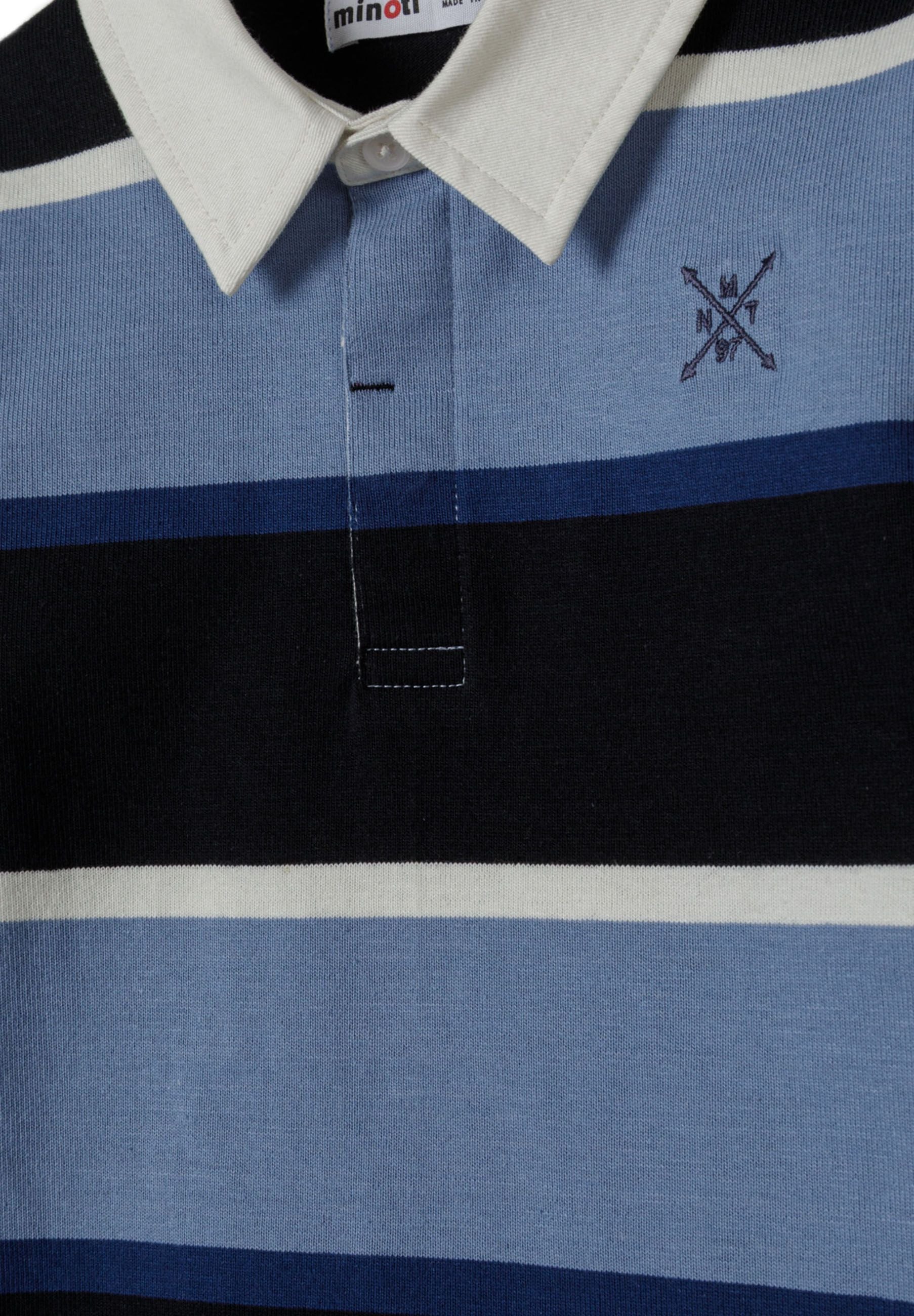 Ten miękki, elastyczny materiał zapewnia komfort i praktyczność przez cały dzień, zaprojektowany z myślą o aktywnym użytkowaniu. Granatowo-białe szerokie poziome paski oferują klasyczny styl inspirowany rugby o ponadczasowym uroku. Tkany kołnierz kontrastuje z paskowanym korpusem, dodając strukturalny detal przy dekolcie, a ukryta listwa guzikowa zapewnia czysty, minimalistyczny wygląd. Subtelna haftowana aplikacja na piersi dodaje sportowego akcentu, nie przytłaczając wzoru, a ściągacze na mankietach gwarantują dopasowanie i wygodę na nadgarstkach. Przeznaczona do noszenia na podstawowe koszulki lub samodzielnie, sprawdzi się w szkole, podczas weekendowych aktywności czy na nieformalne okazje, łącząc funkcjonalny design z ponadczasowym stylem.