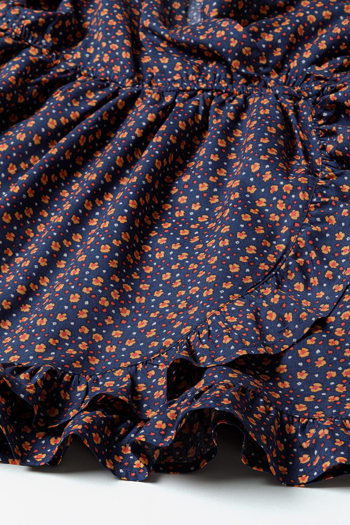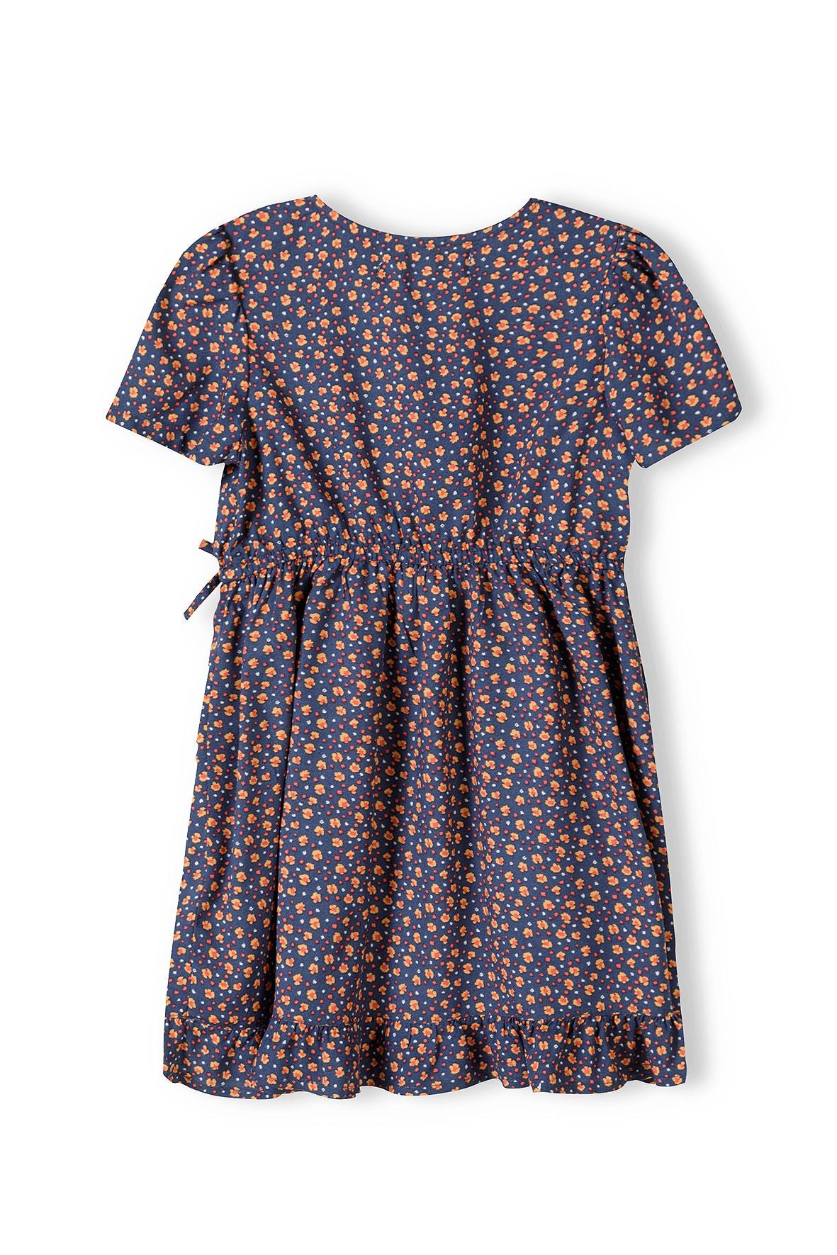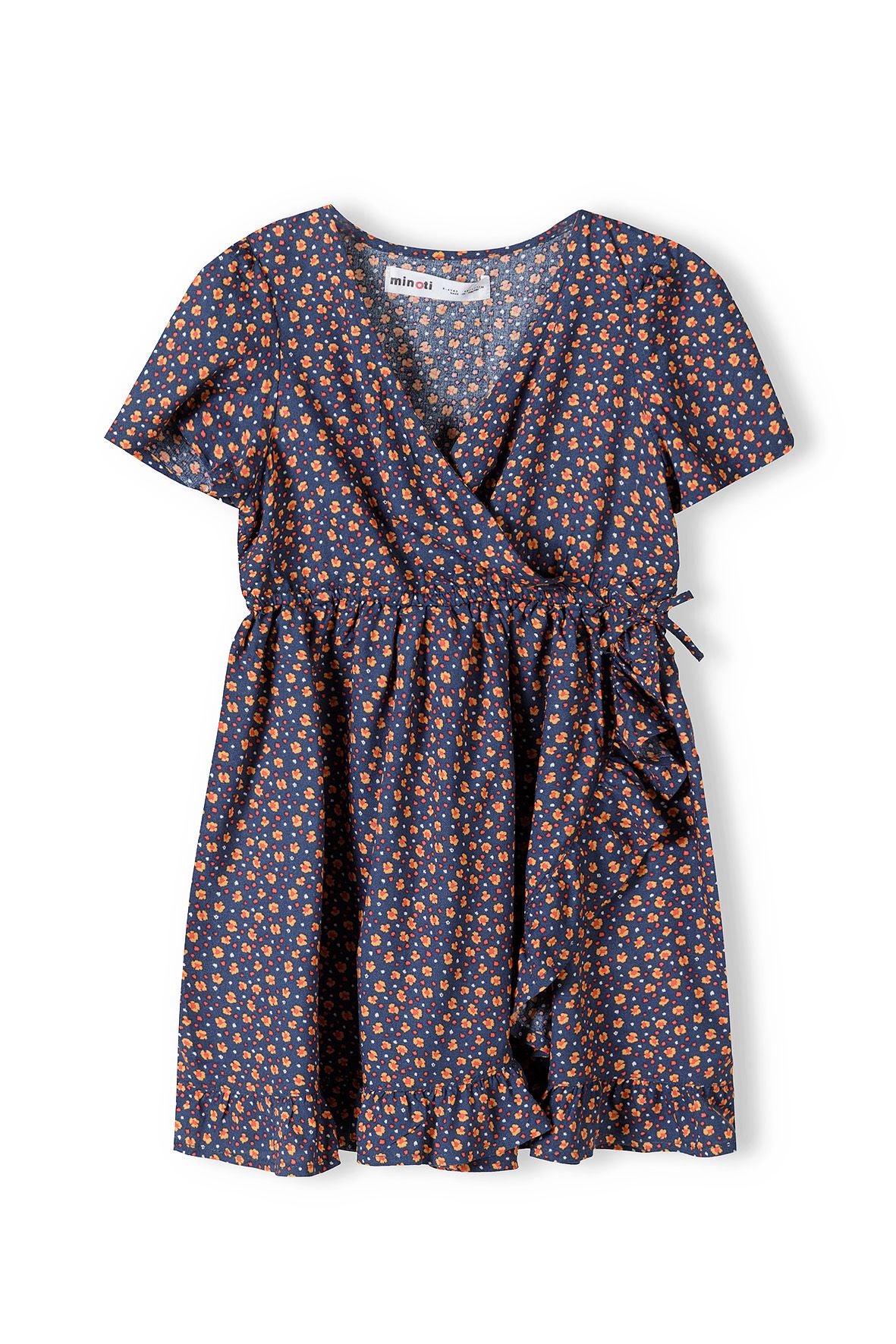 Granatowa sukienka z drobnymi kwiatkami z falbaną i kopertowym dekoltem 3-8 łac