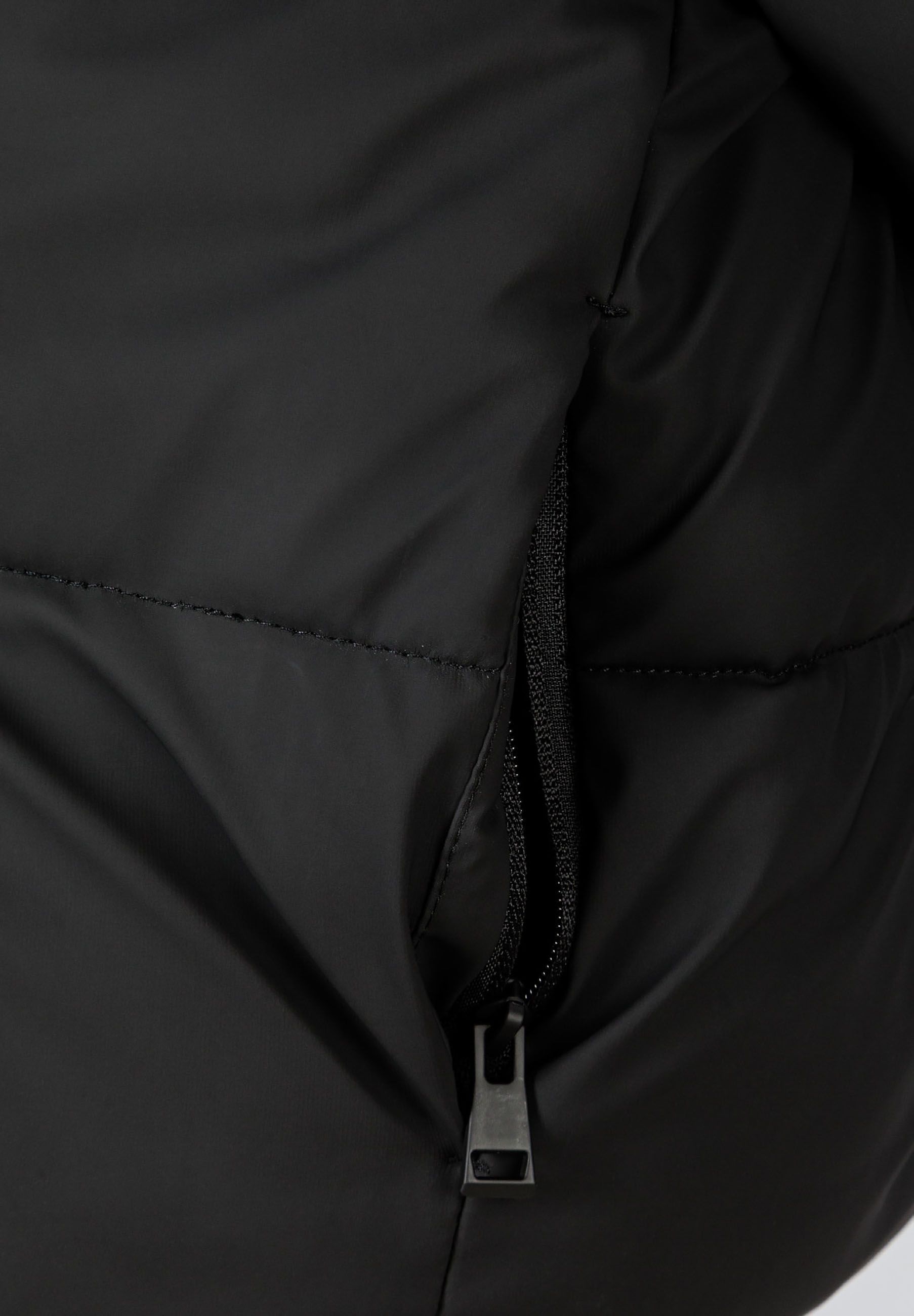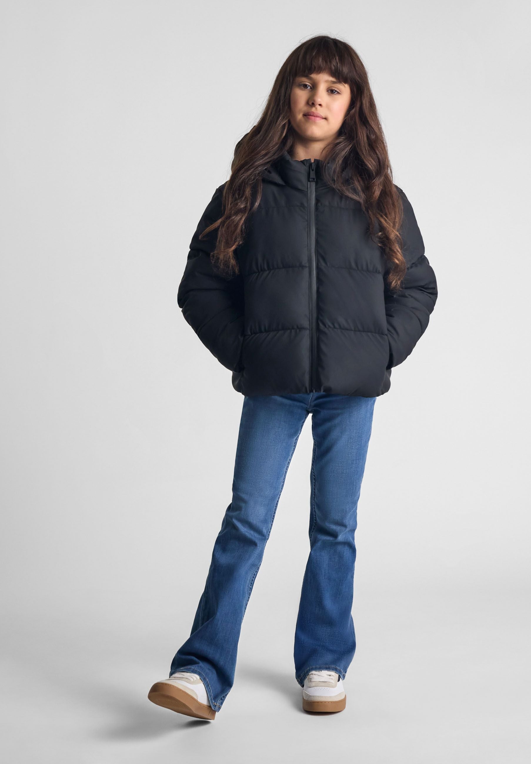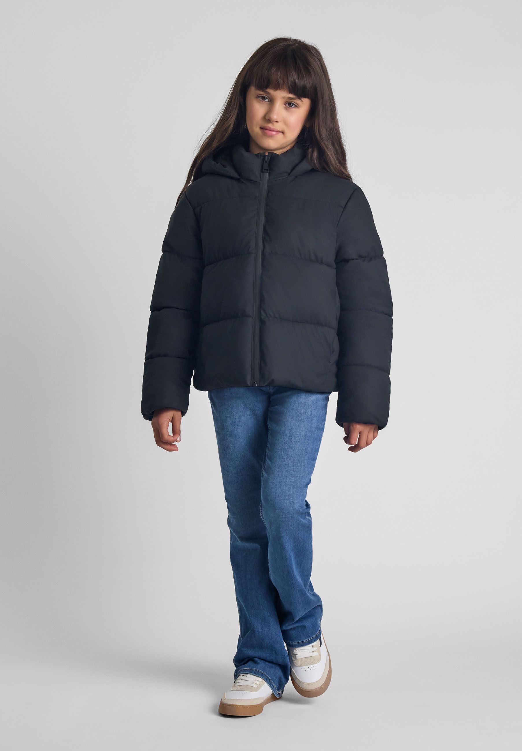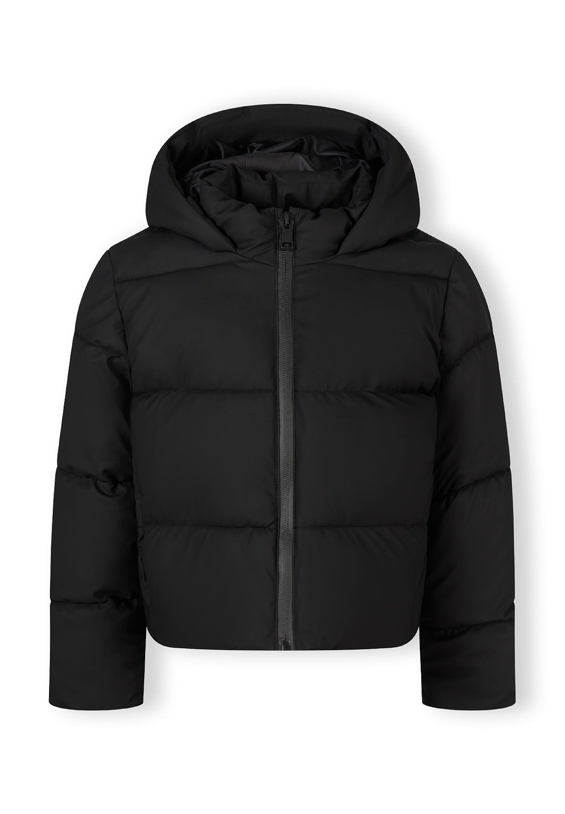 Black short quilted jacket with a hood and a stand-up collar 2-14 y