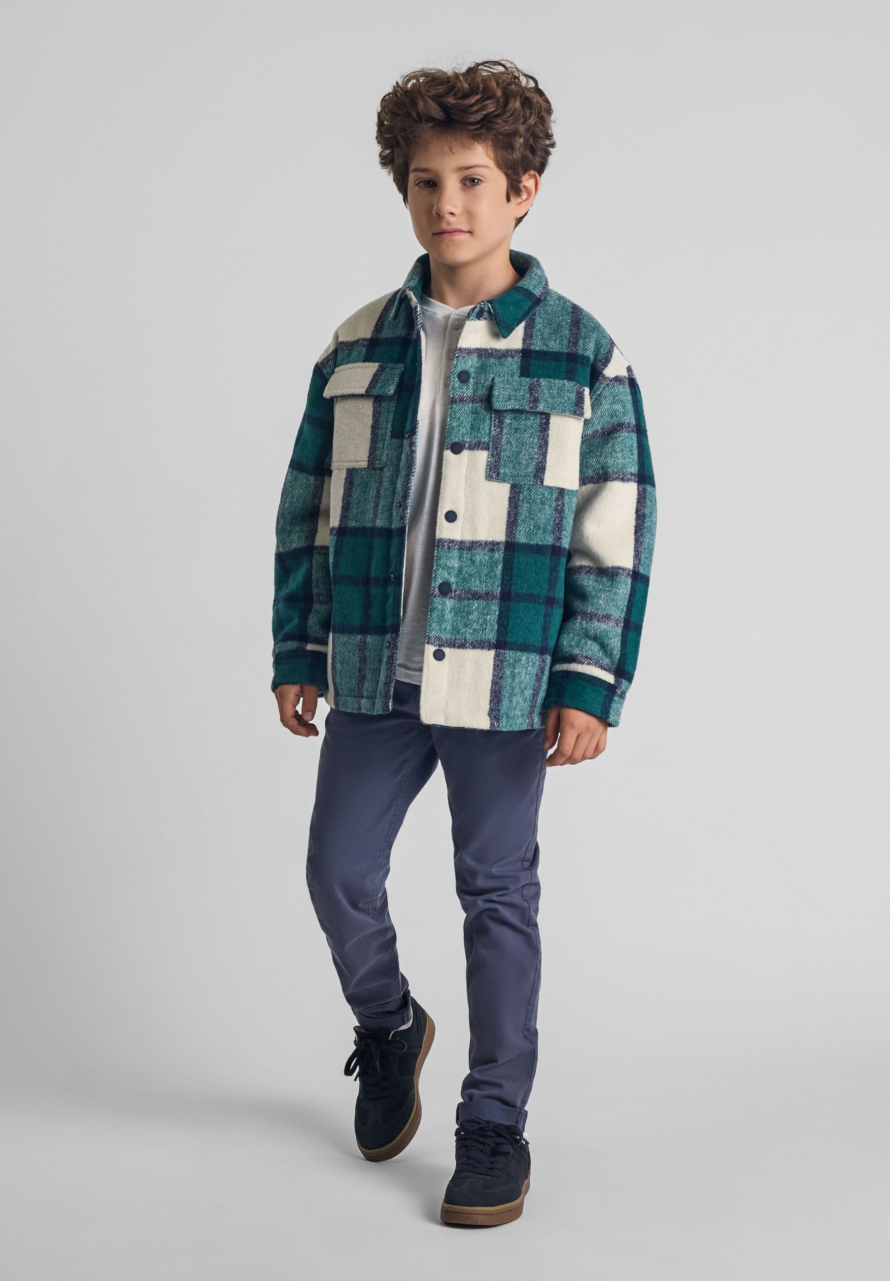 Smart, warm, and built for real life. This boys' padded shirt jacket in a classic green check pattern combines timeless style with practical insulation — perfect for chilly days when a regular jacket just isn't enough. Made from a wool blend fabric with a quilted lining and full padding, it delivers sustained warmth while keeping a relaxed, layerable fit. Available in sizes from 2 to 14 years.