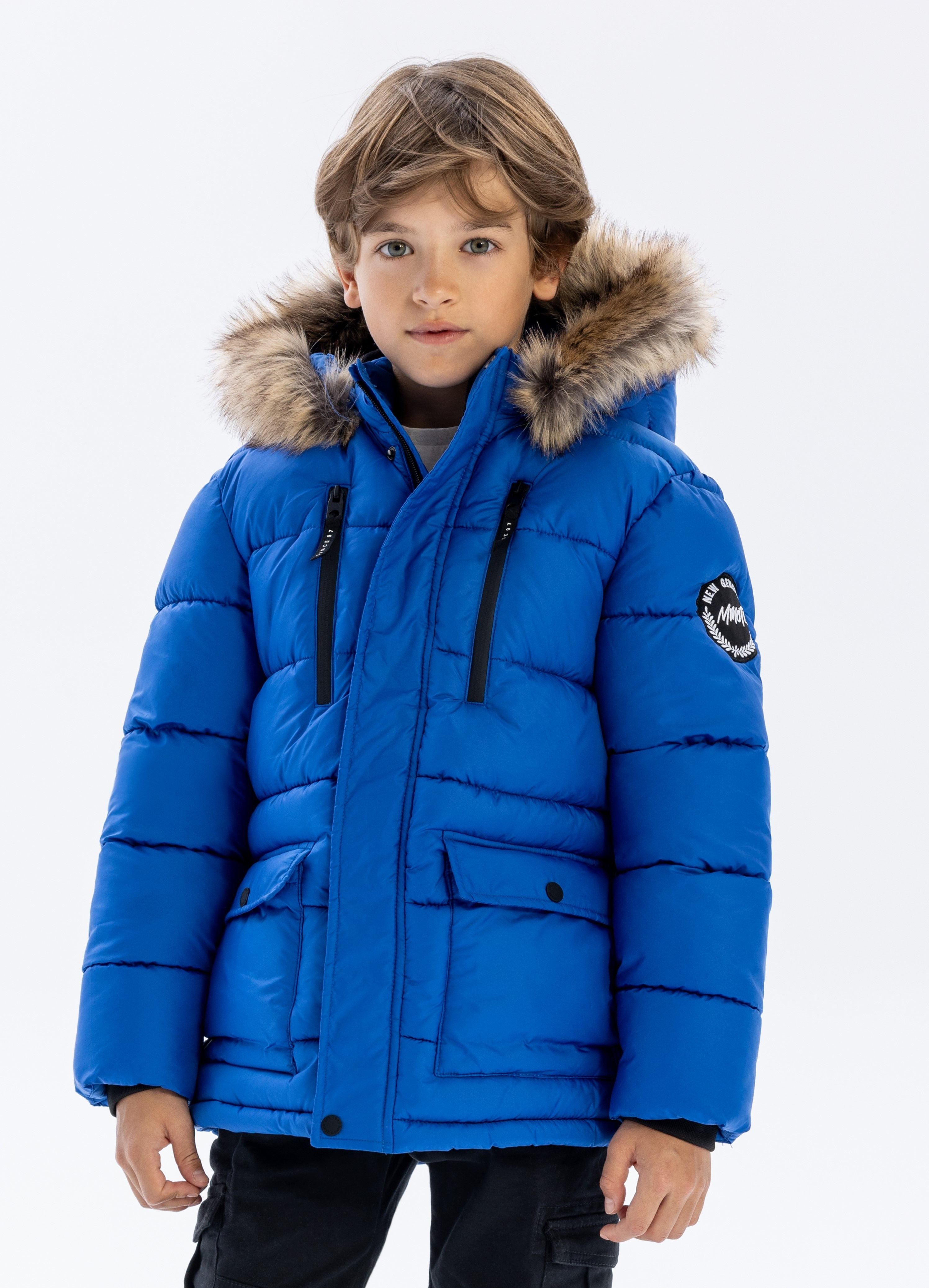 A boys jacket tailored for cold weather protection with a cobalt blue outer shell. it includes a detachable hood trimmed with faux fur, secured by snaps for simple removal. the jacket features a double front closure combining a zip and an outer placket to help block cold air. two flap pockets on the front conceal hidden fleece-lined side pockets, providing warmth and secure storage. inside, the body is insulated with polar fleece lining, while the sleeves have a smooth lining to facilitate easy dressing and movement. the jacket is finished with a rubber badge on the sleeve and elasticised internal cuffs to improve fit and retain heat.