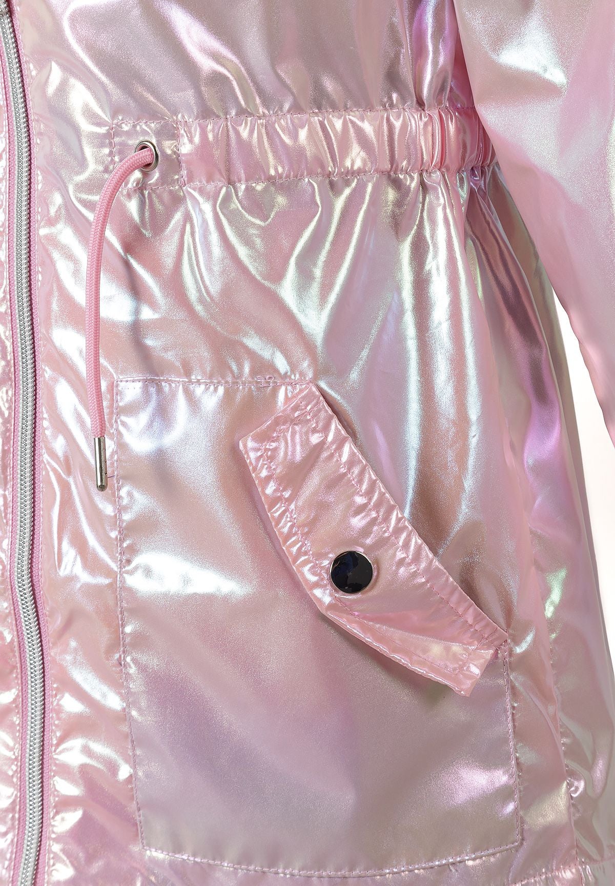 Girls hooded shiny jacket pink with drawstring waist flap pockets and reflective sheen 2-14 years