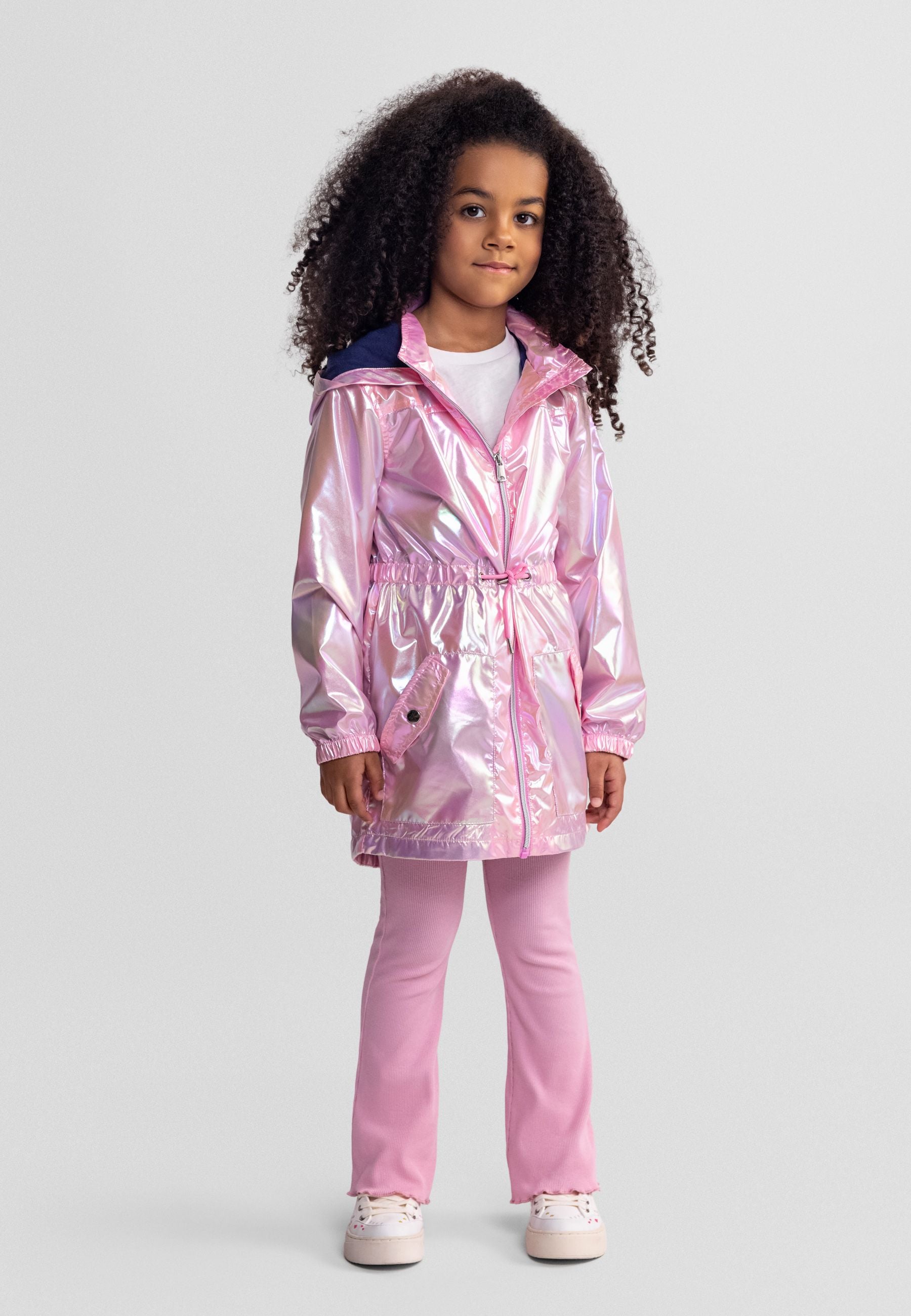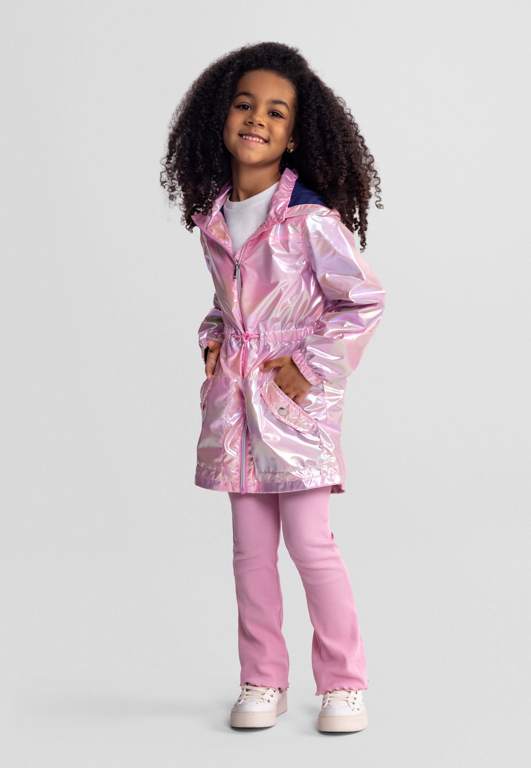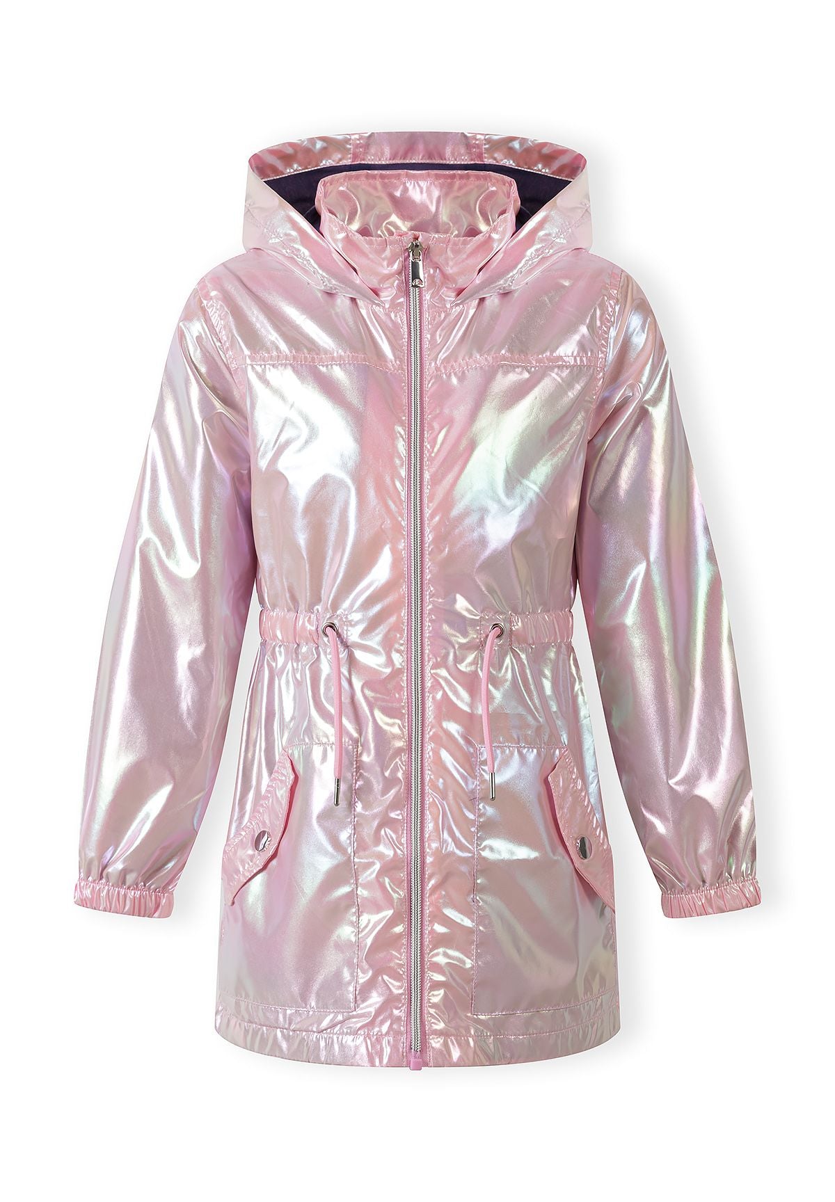 Girls hooded jacket in a shiny pink finish offers a visually striking outer layer for cool weather. It features a front zip closure and an adjustable drawstring waist for a personalised fit. With attached hood and flap pockets, it provides practical coverage and convenient storage.