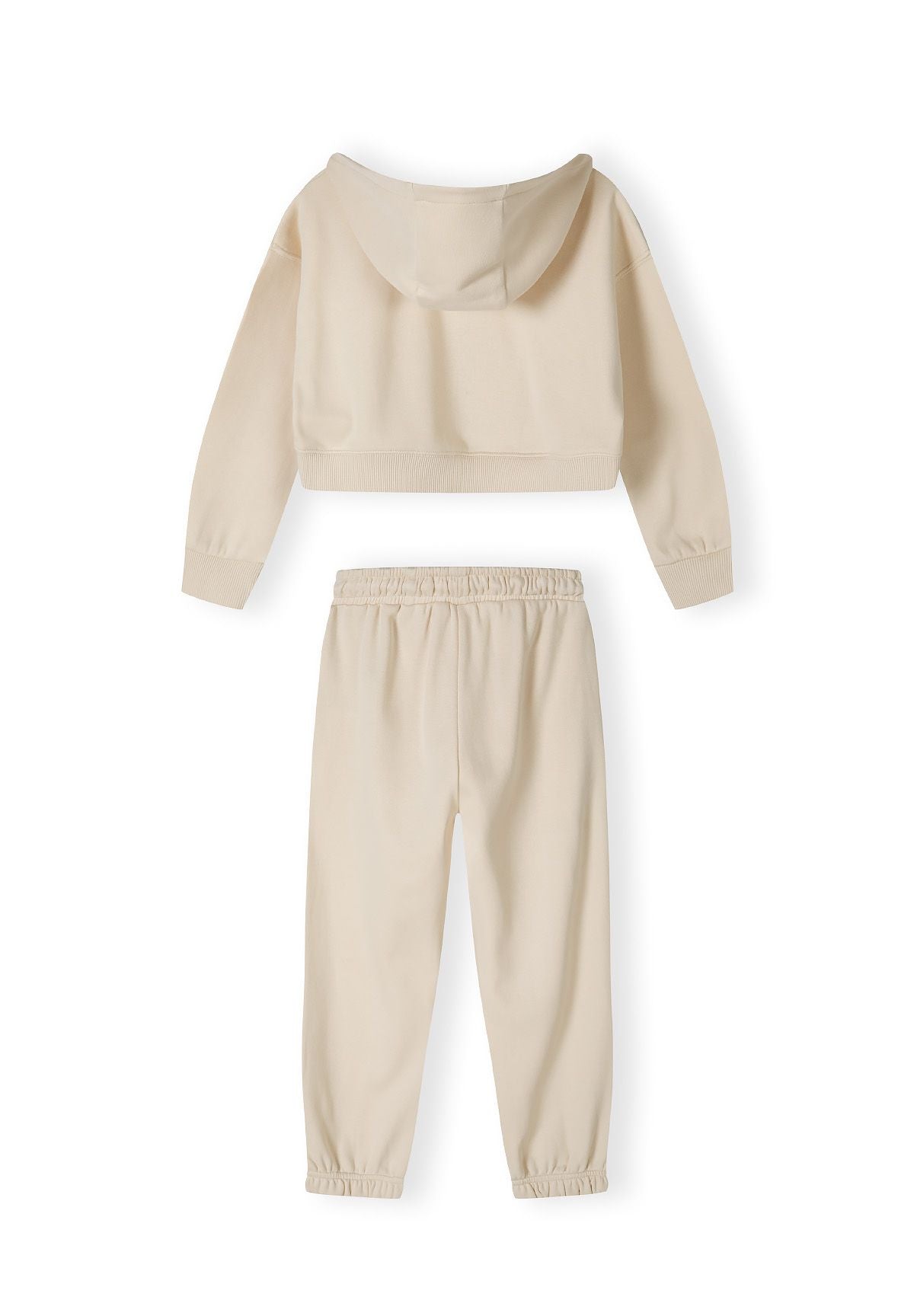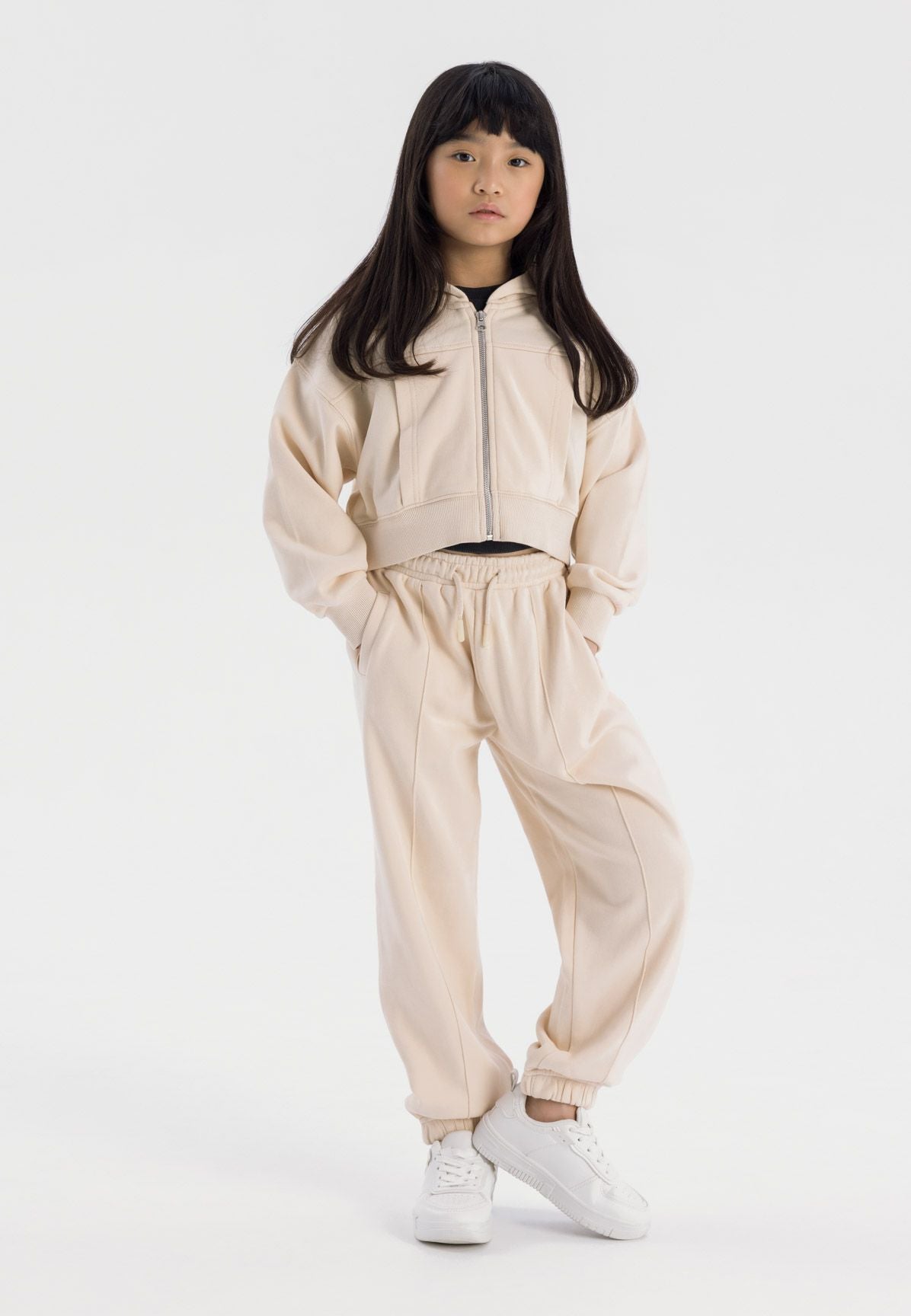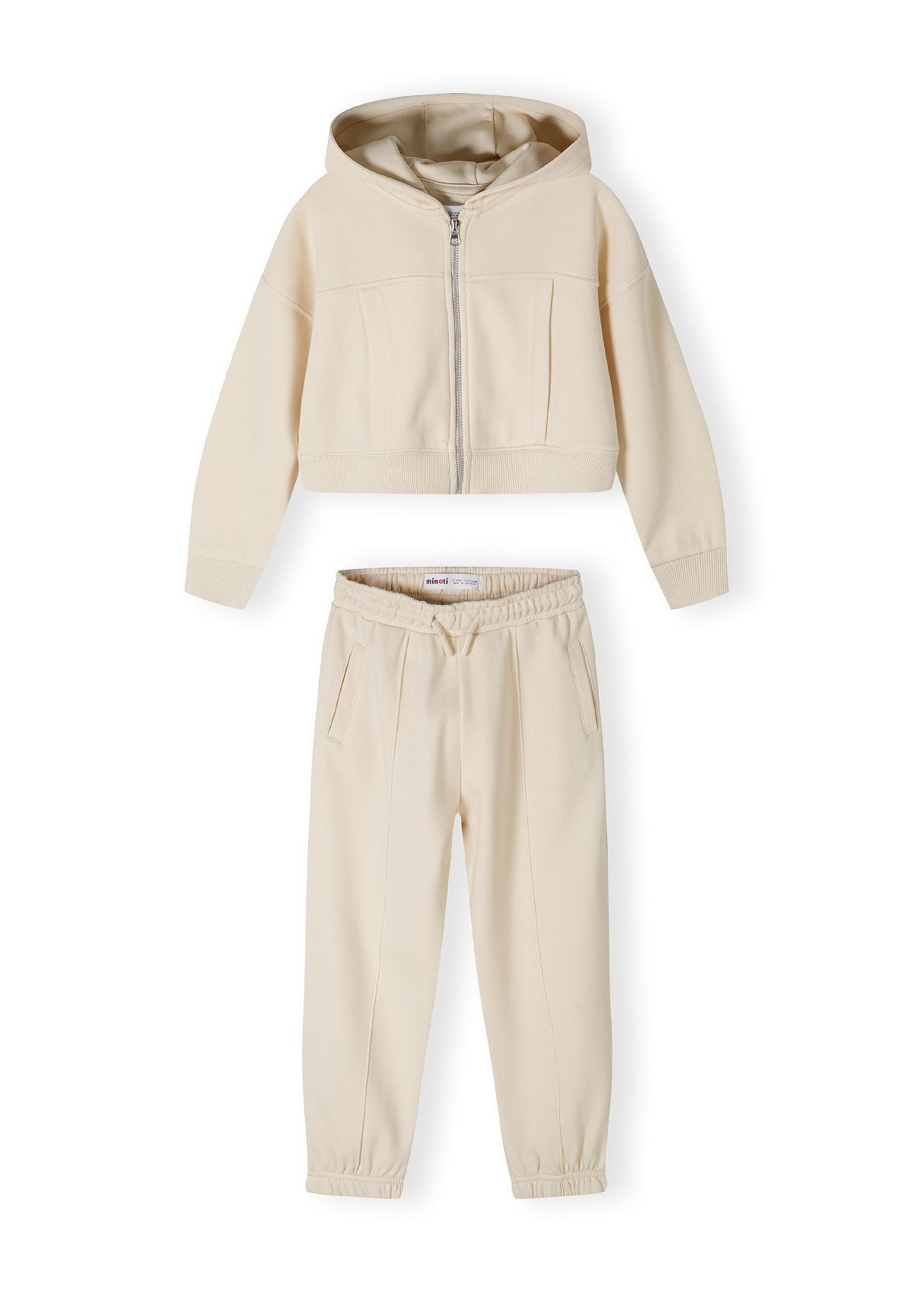 A clothing set consisting of a padded sweatshirt and pants, designed for girls. Made from a smooth-textured material, it ensures comfort while wearing. The color scheme features a deep, dark navy. The sweatshirt has a short cut that reaches the waist, with a hood. It has a round neckline, and the long sleeves are finished with ribbed cuffs. There is a metal zipper at the front and two patch pockets. The pants have a loose fit, with an elastic waistband adjustable by a drawstring, and the length reaches the ankles. The ends of the legs have ribbed cuffs, and the pants feature two discreet pockets in the side seams. The entire set is minimalist, without additional patches or embroidery, highlighting a modern style. This set is perfect for everyday outings, providing comfort and a fashionable look.