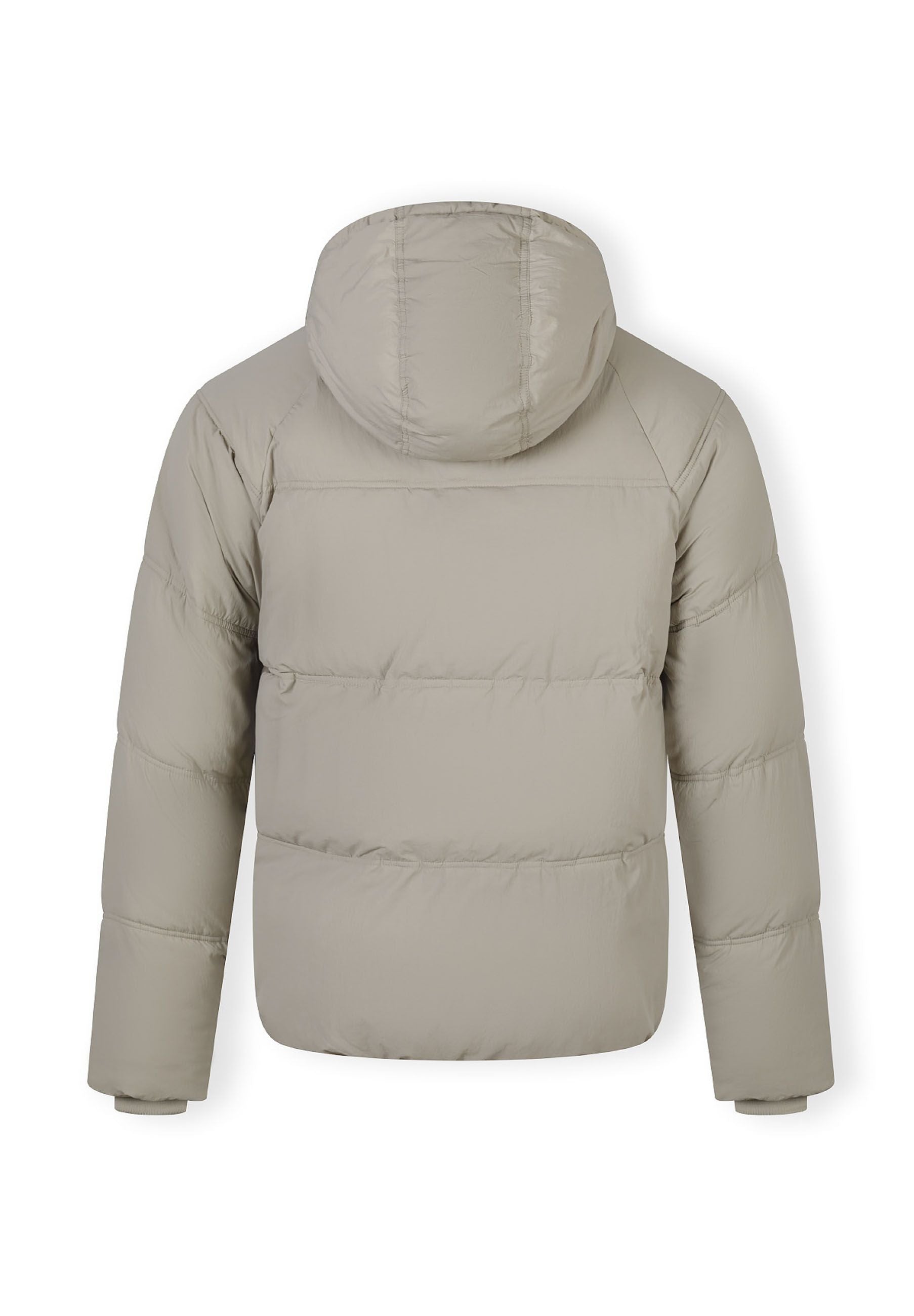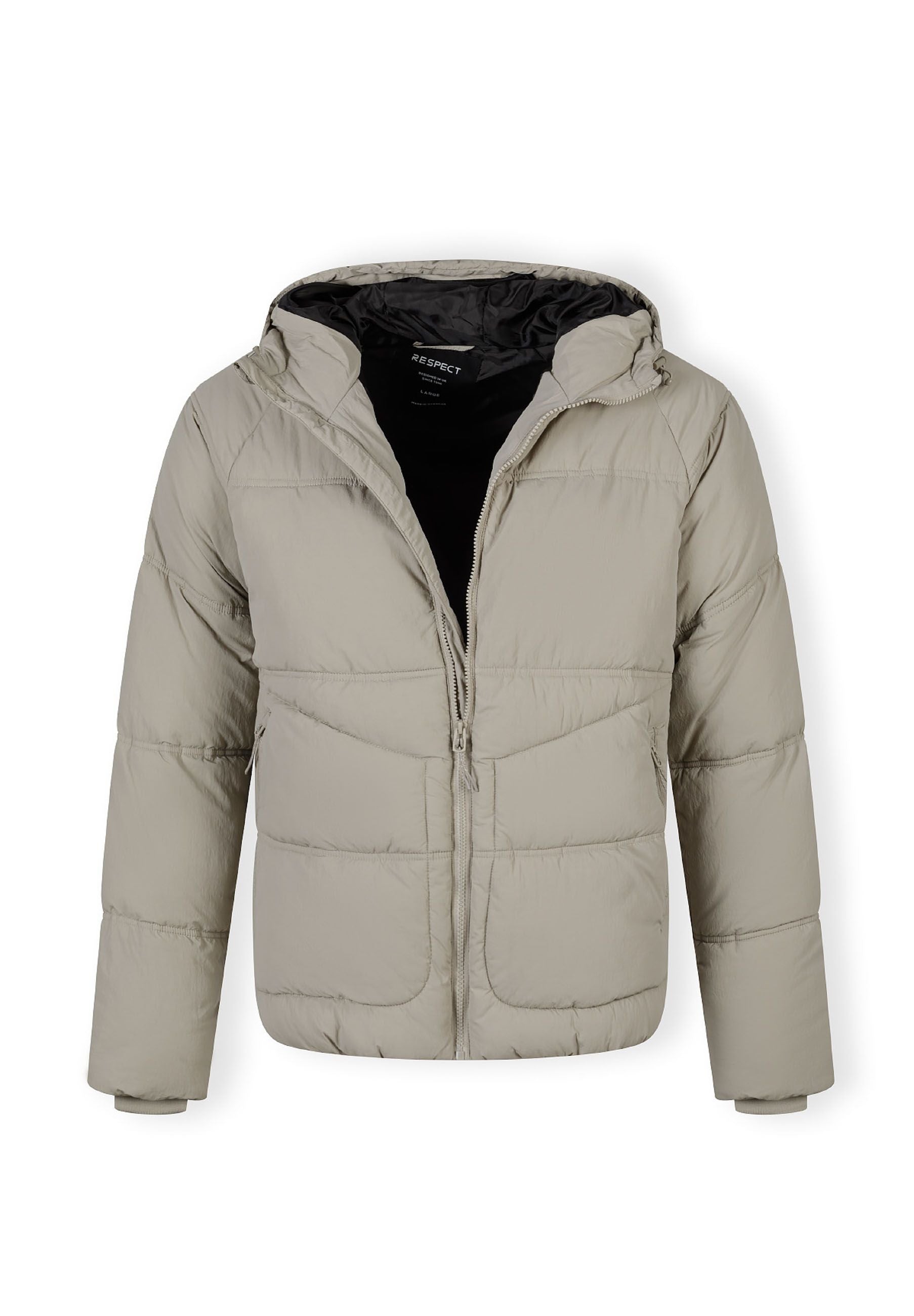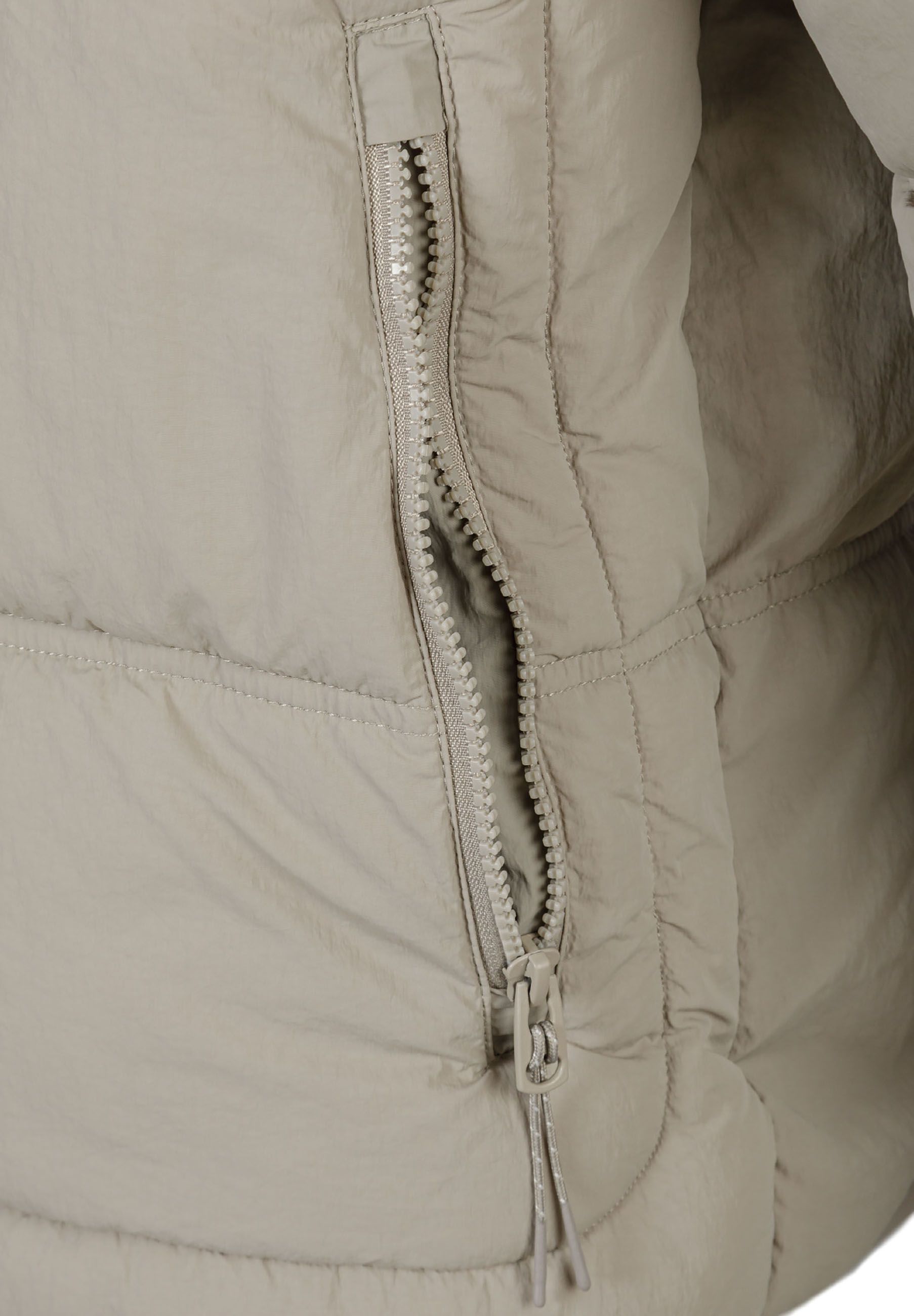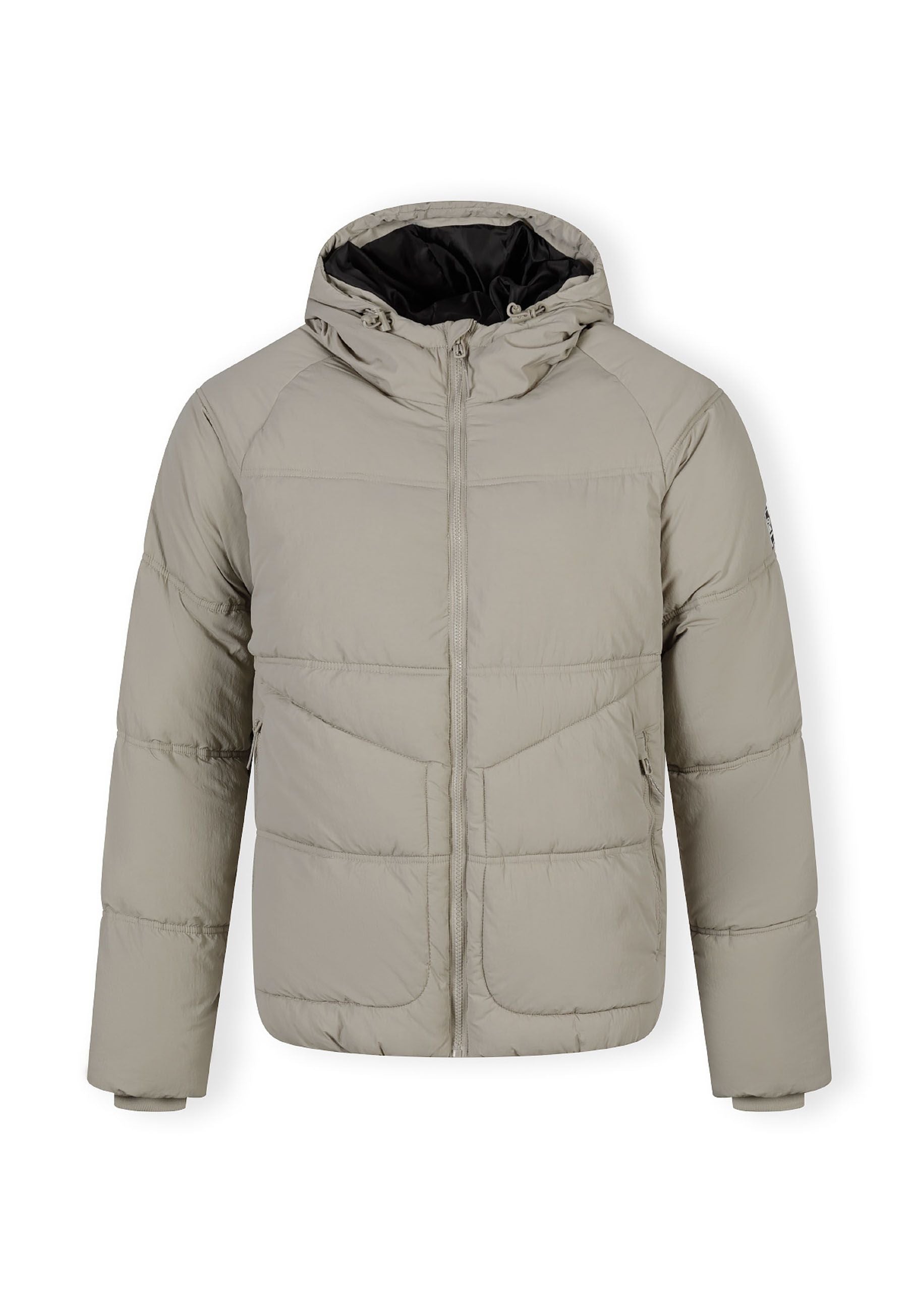 A boys quilted jacket designed for outdoor wear, suitable for cooler weather conditions. the jacket is presented in grey with a quilted texture. it features raglan sleeves that allow for improved arm movement and comfort. the garment includes elasticated cuffs and a gathered bottom hem to help retain warmth. functional zipped side pockets provide secure storage. additional construction elements include a high collar and an adjustable hood equipped with toggle fasteners. a rubber patch detail on the sleeve adds a casual, sporty accent to the design. the jacket is structured to offer practical protection against wind while maintaining a lightweight feel.