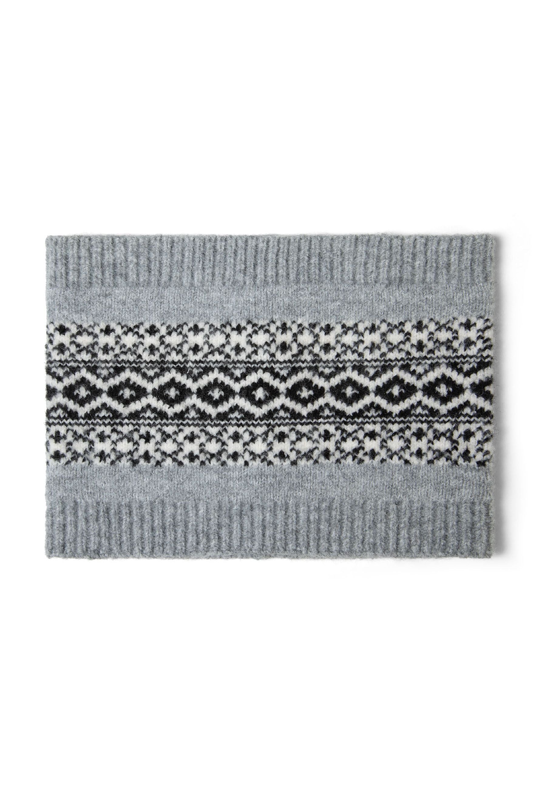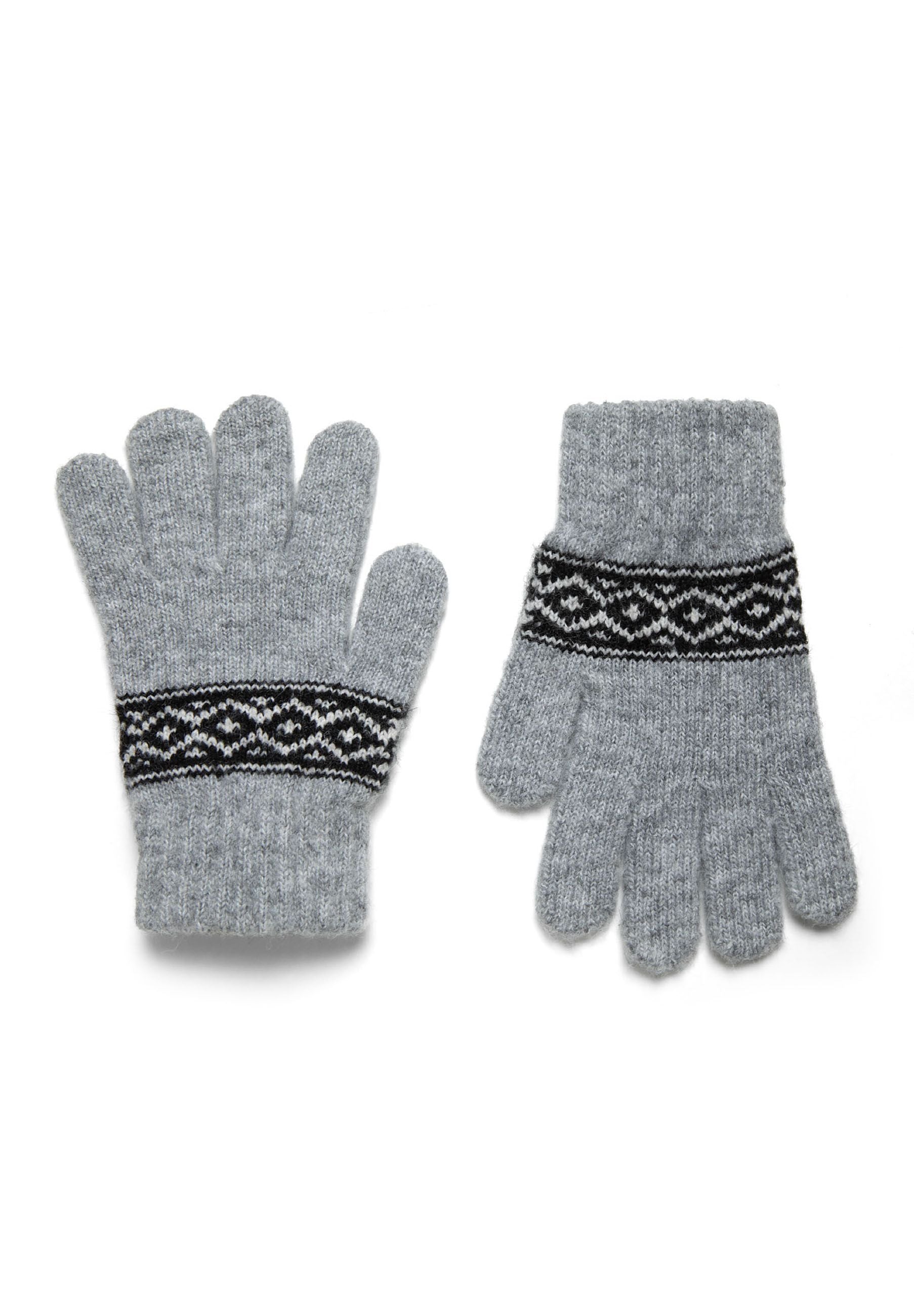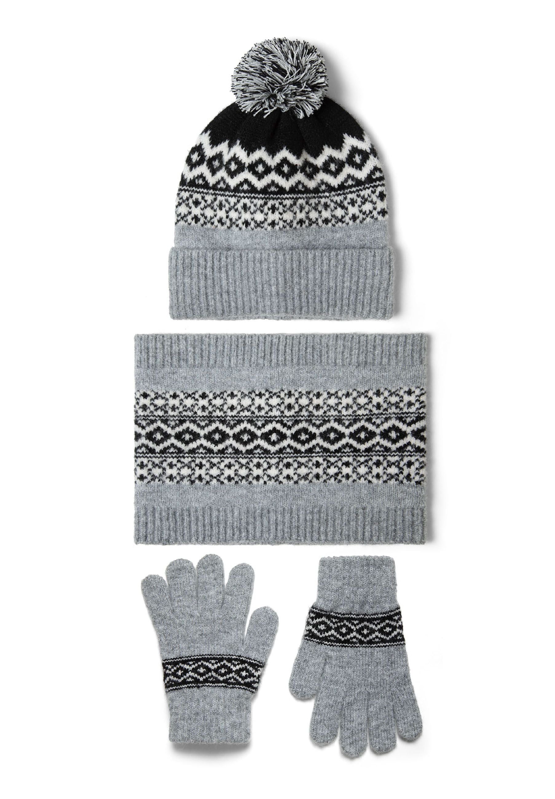 Vinterstickad mössa, halsduk och vantar set Fair Isle grå